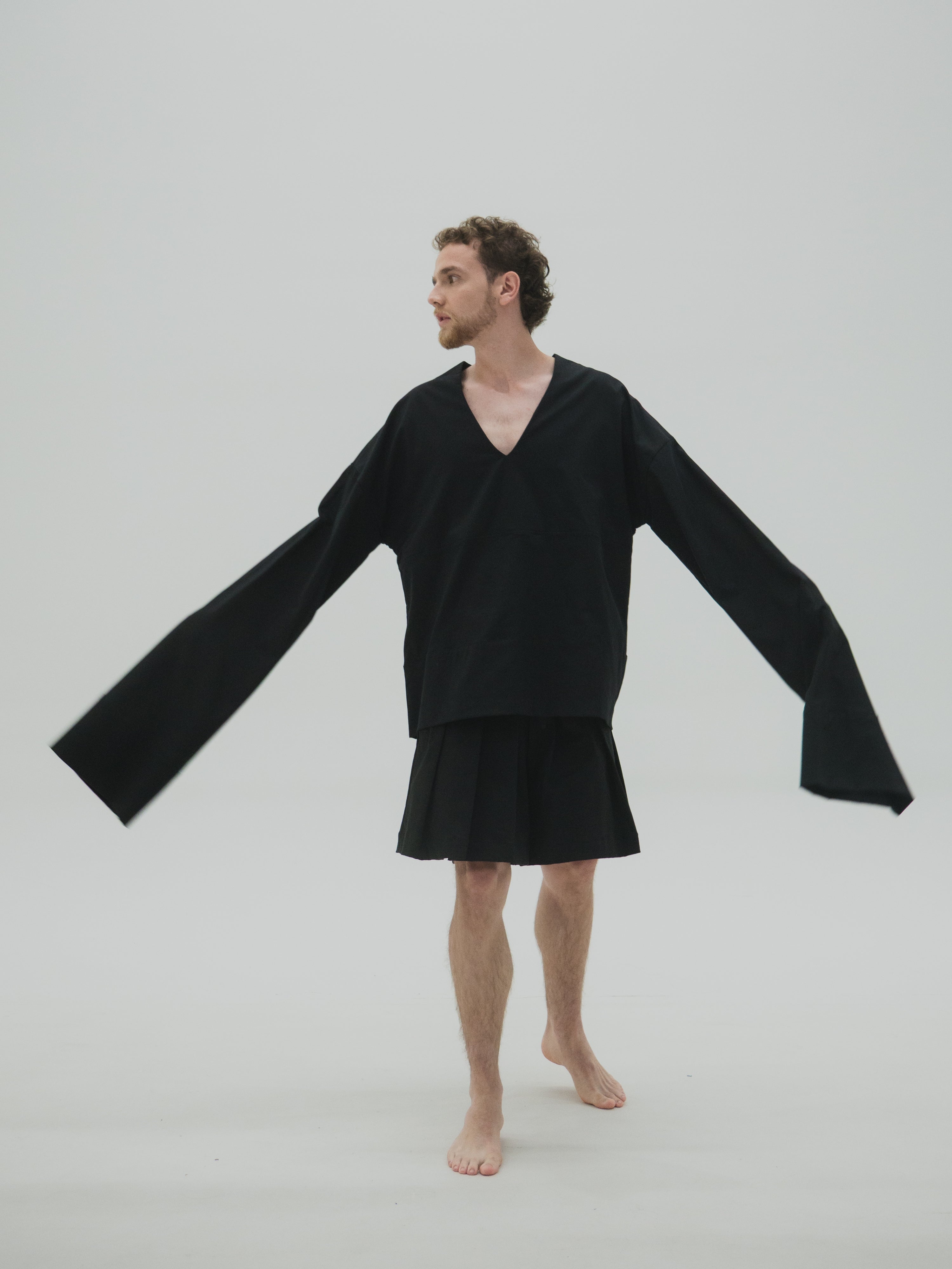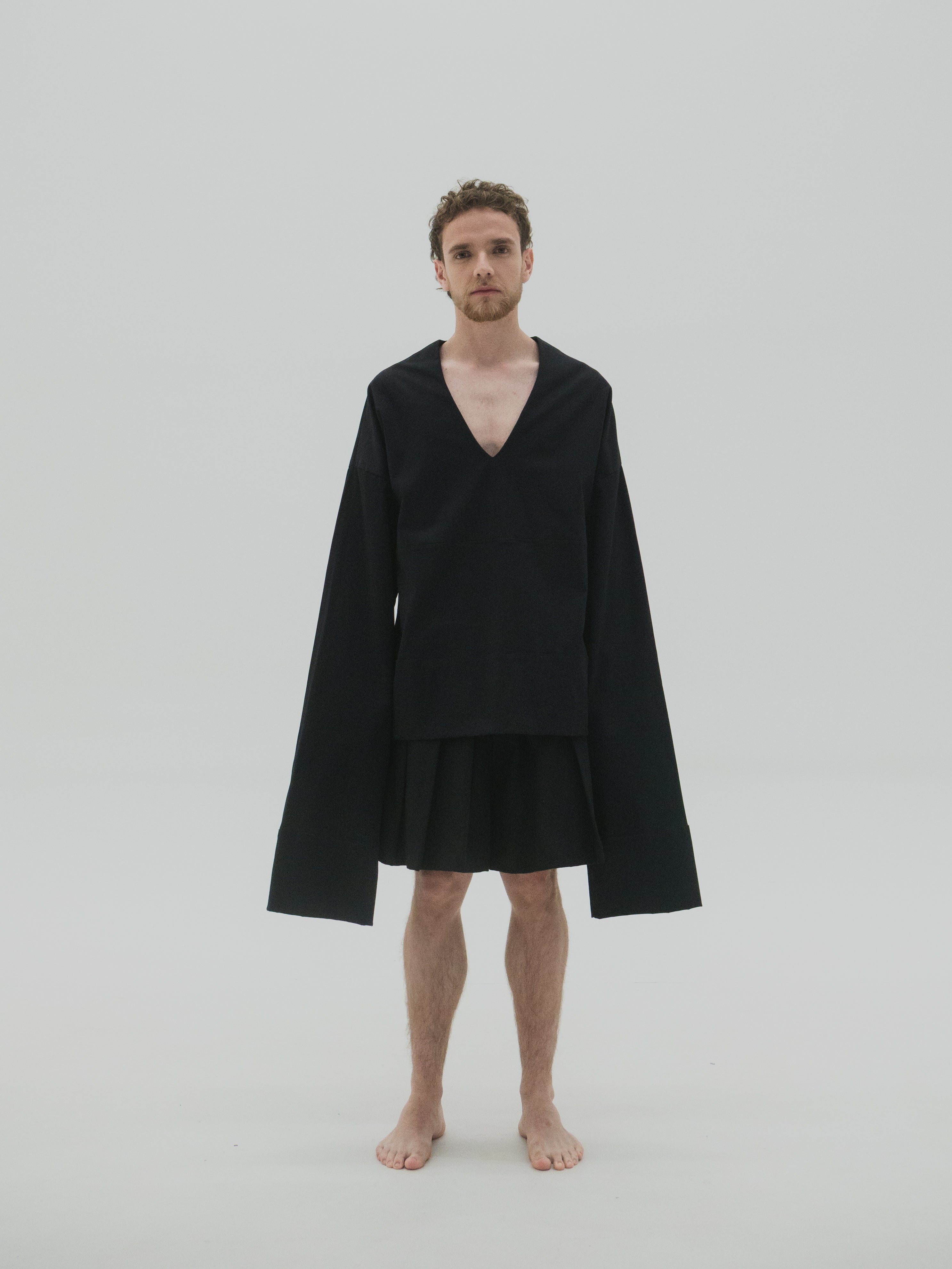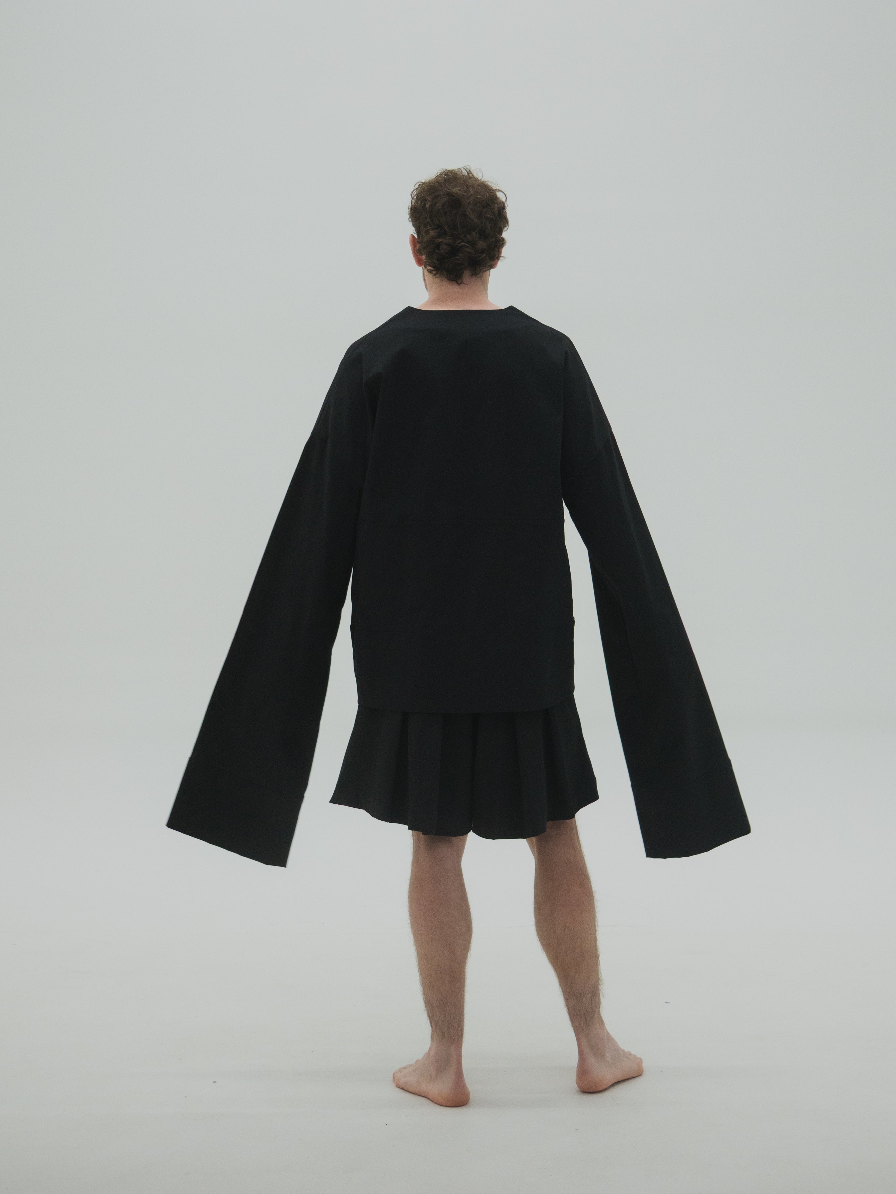 Camisa oversized de mangas largas acampanadas y drapeado interno a la altura del antebrazo. El volumen de las mangas se construye a partir de una intervención manual punto por punto, generando tensión controlada en la caída. La estructura amplia y fluida permite libertad de movimiento, manteniendo una lectura formal y limpia. Acabados precisos y diseño genderless.