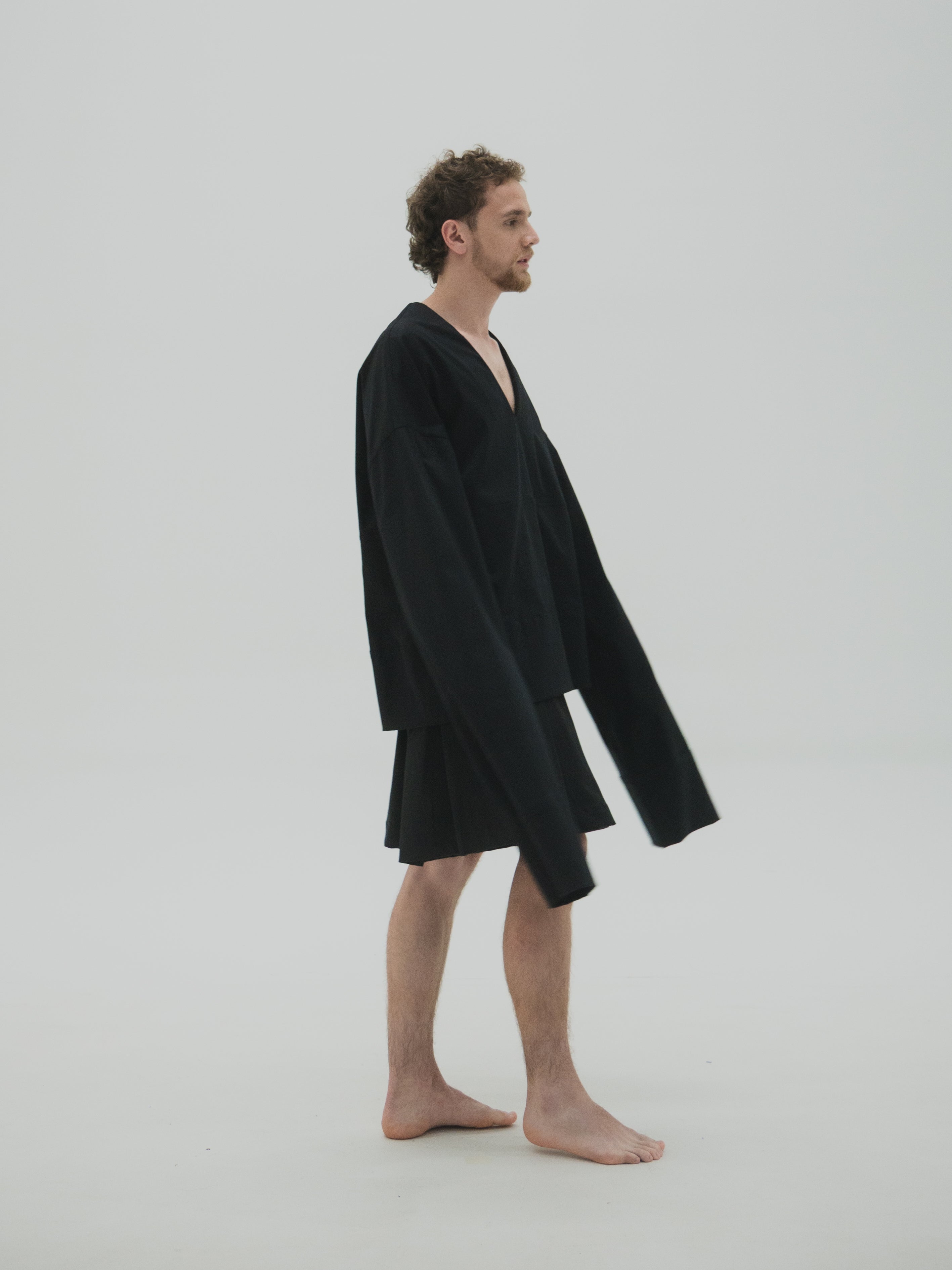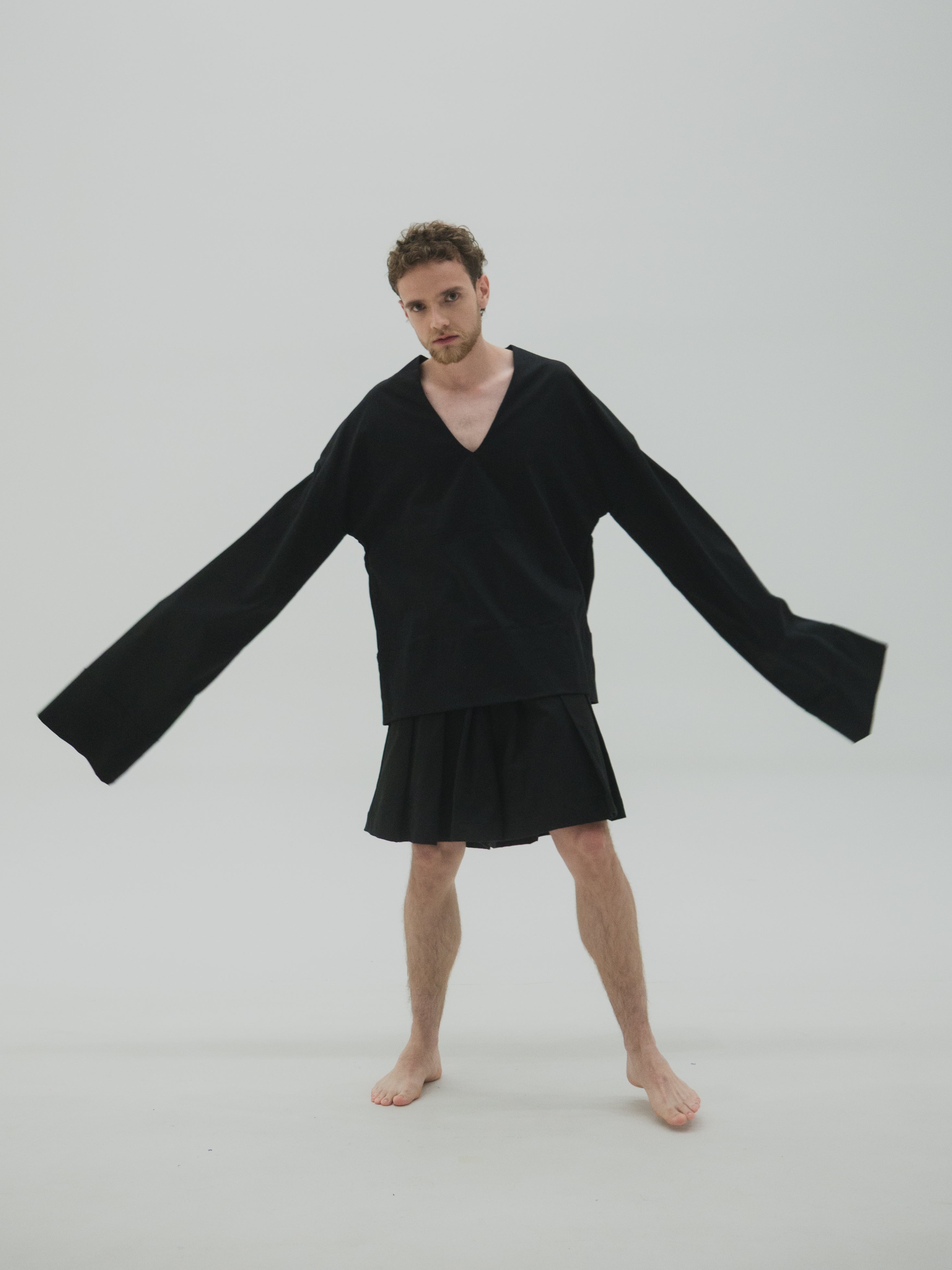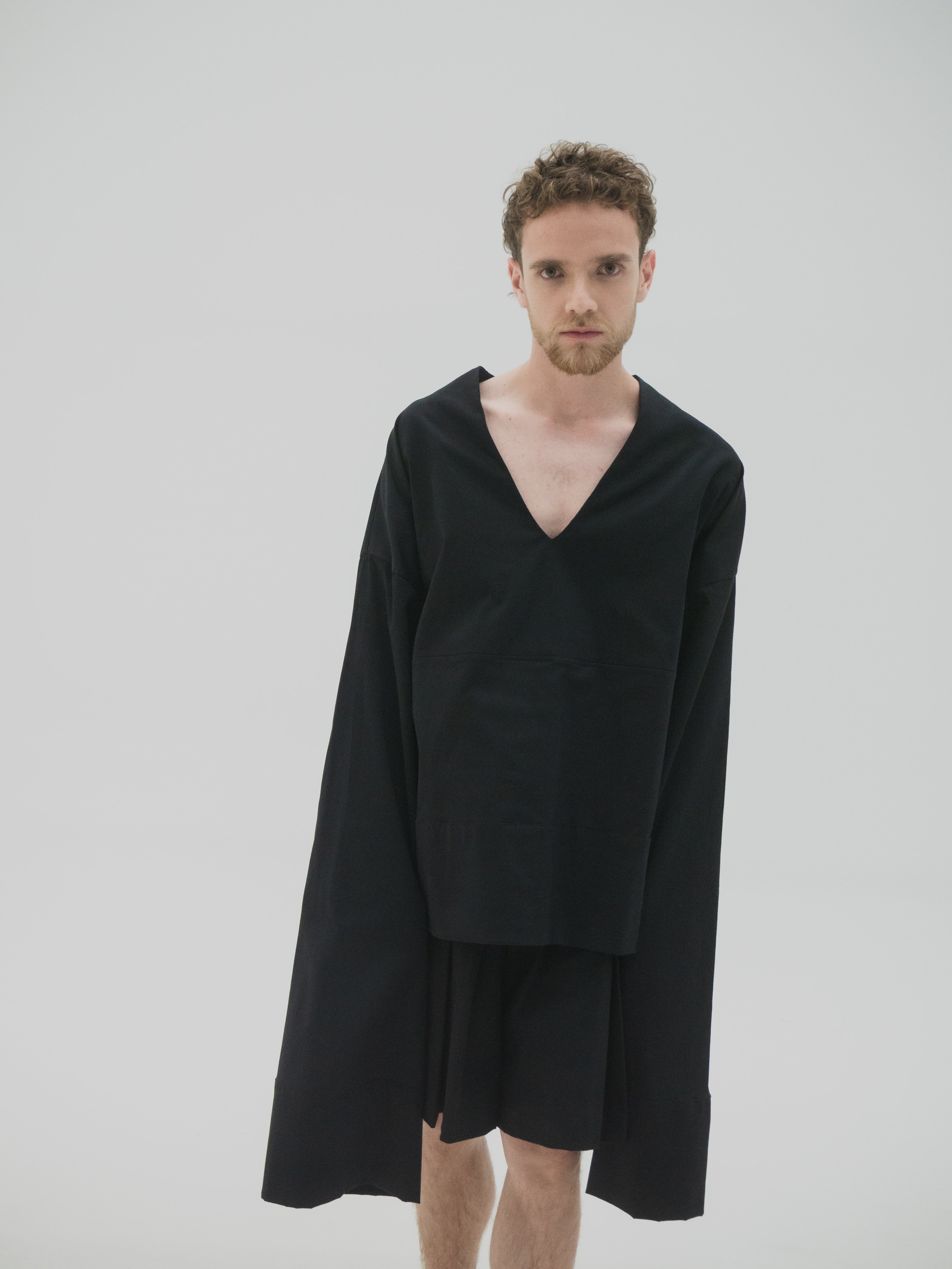 Camisa oversized de mangas largas acampanadas y drapeado interno a la altura del antebrazo. El volumen de las mangas se construye a partir de una intervención manual punto por punto, generando tensión controlada en la caída. La estructura amplia y fluida permite libertad de movimiento, manteniendo una lectura formal y limpia. Acabados precisos y diseño genderless.