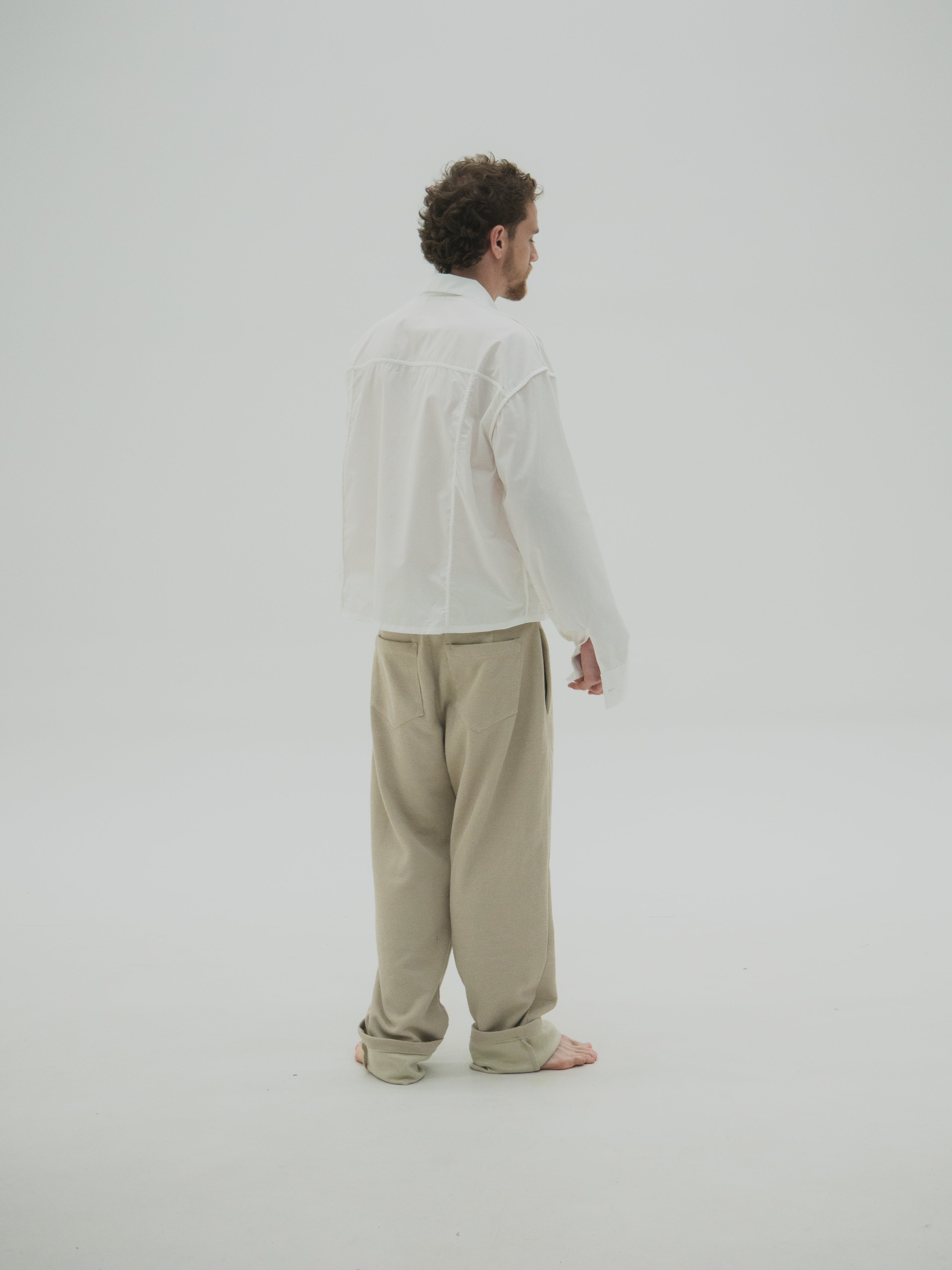 La Edge Shirt redefine la noción de estructura y acabado. Su silueta boxy y sus costuras francesas expuestas, cuidadosamente colocadas en el exterior, desdibujan la frontera entre lo interno y lo visible, generando un efecto visual intencionado que juega con la idea de lo “al revés”.