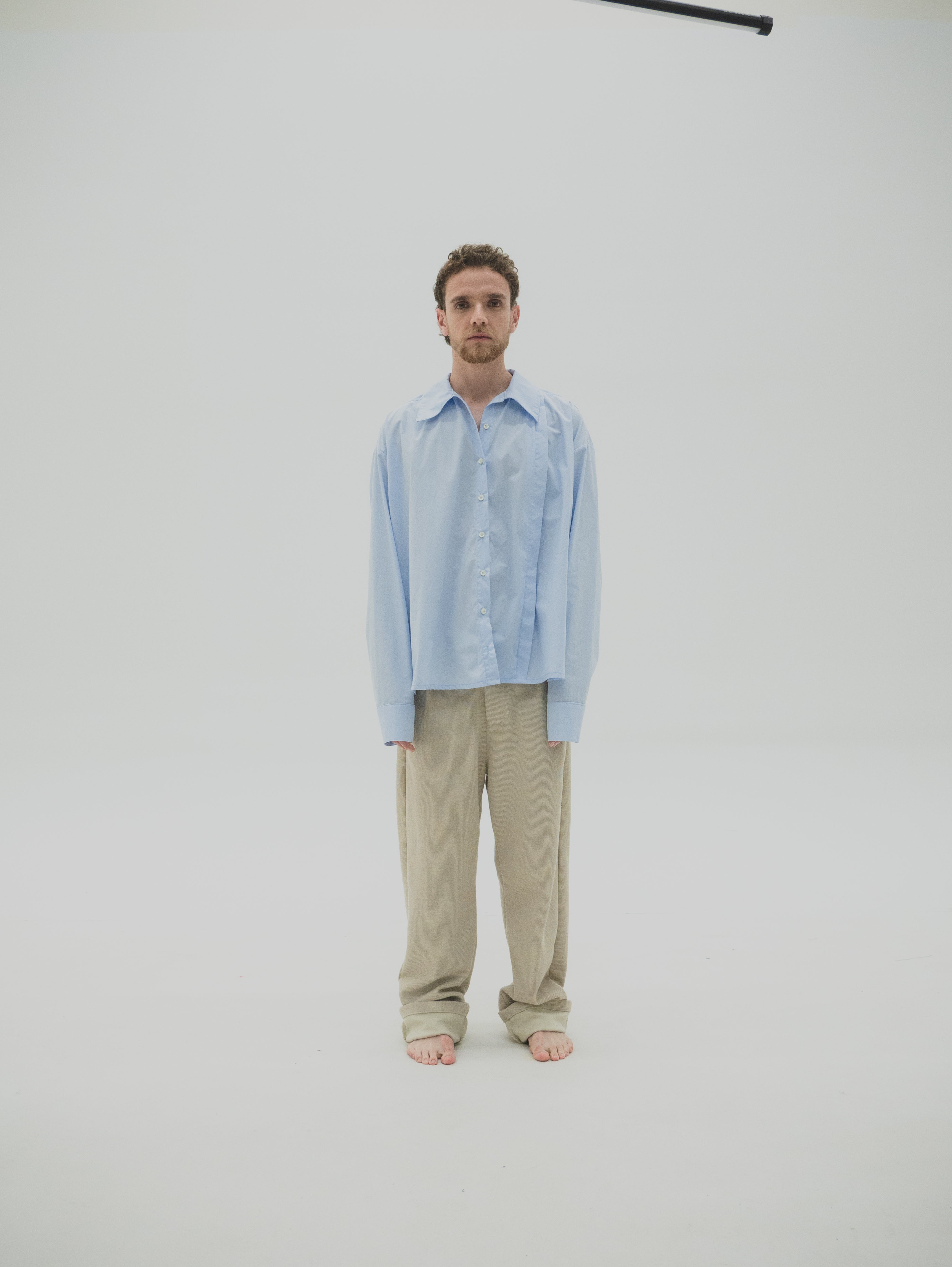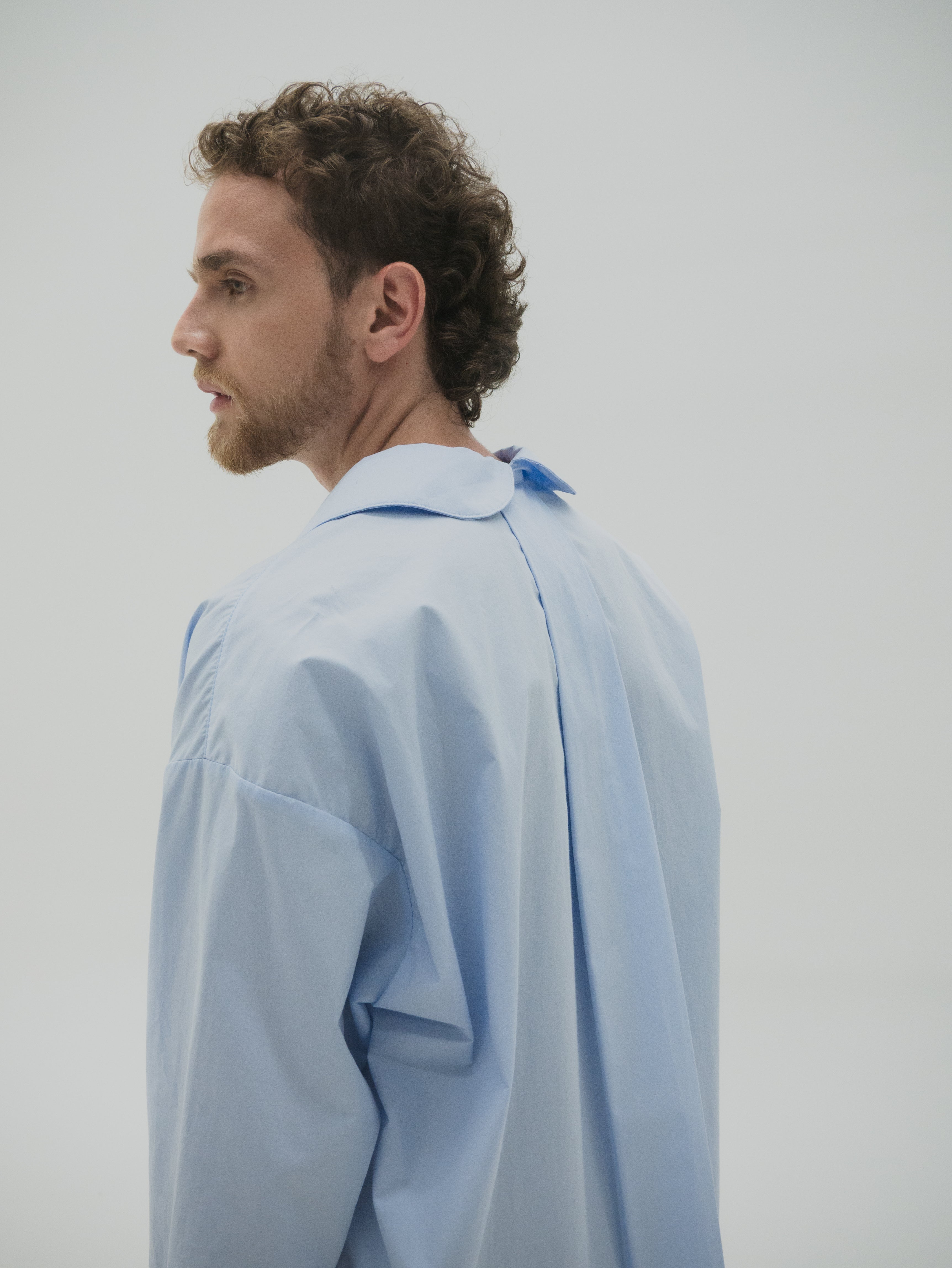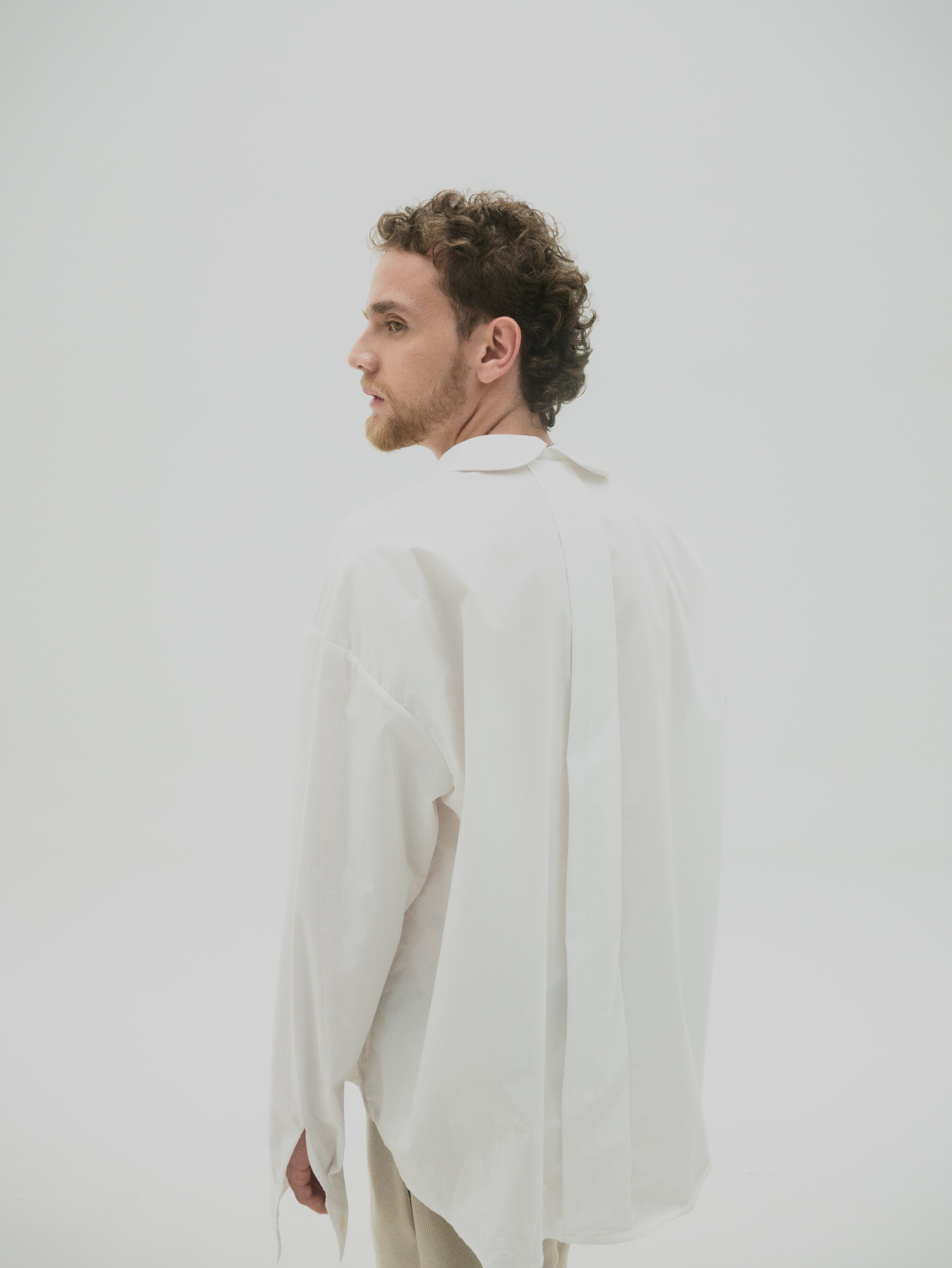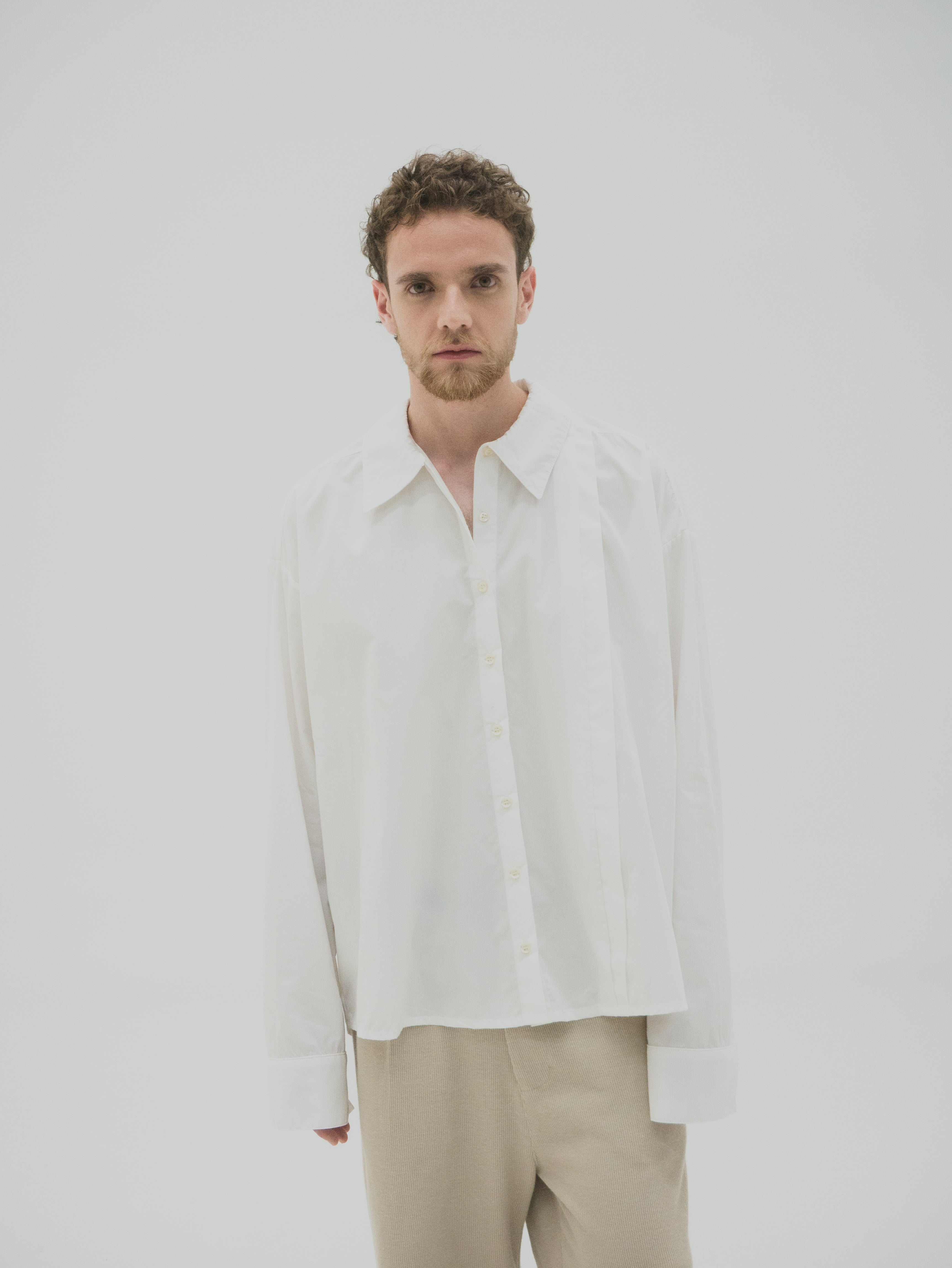 Camisa manga larga con estructura simétrica y silueta ligera. Presenta doble cuello, uno fijo en el espaldar y uno funcional en la parte frontal. Incluye pliegues laterales que genera volumen moderado sin comprometer la caída de la prenda, aportando un extra en el diseño de la pieza. Hecha en algodón ecológico.