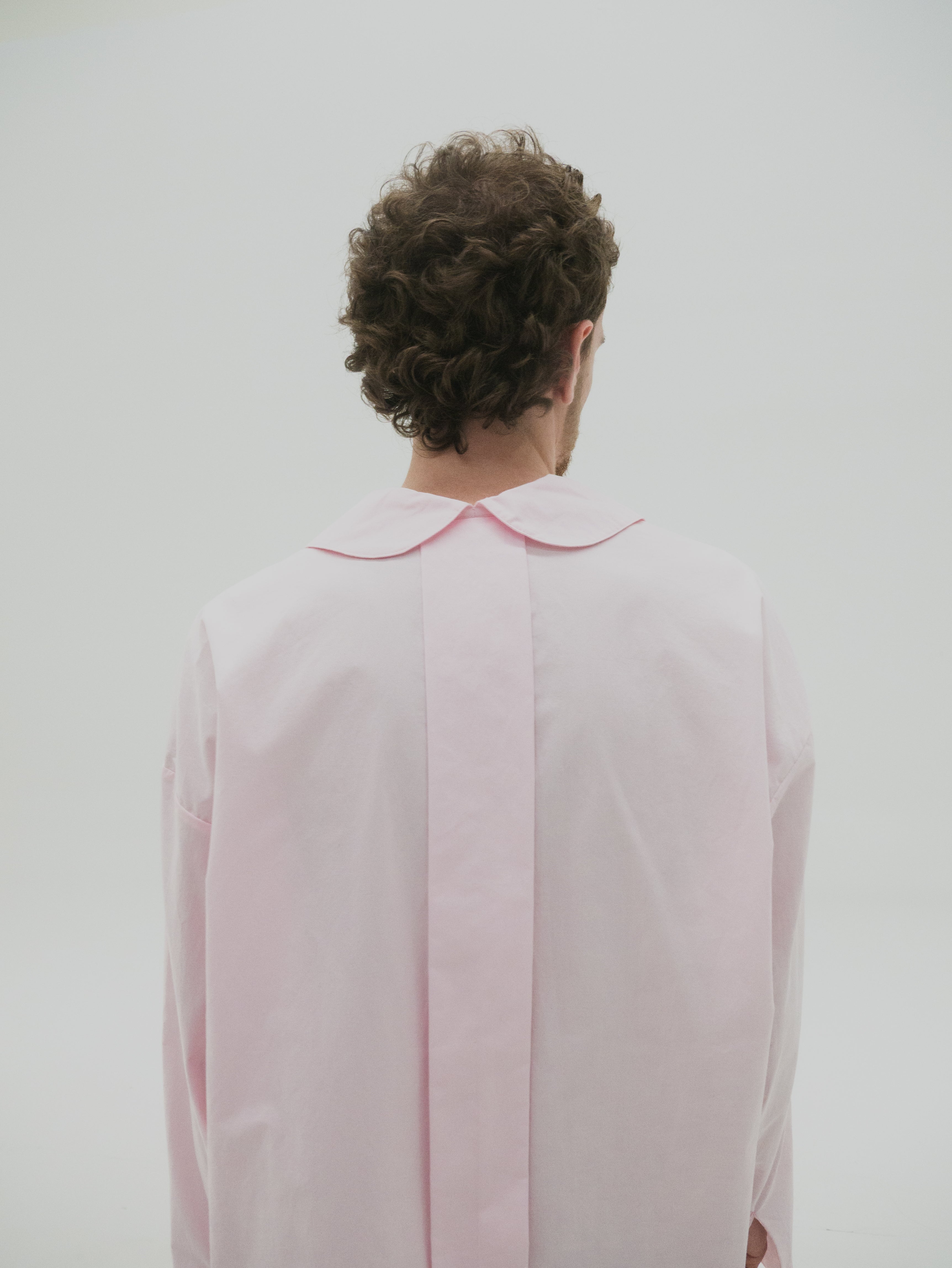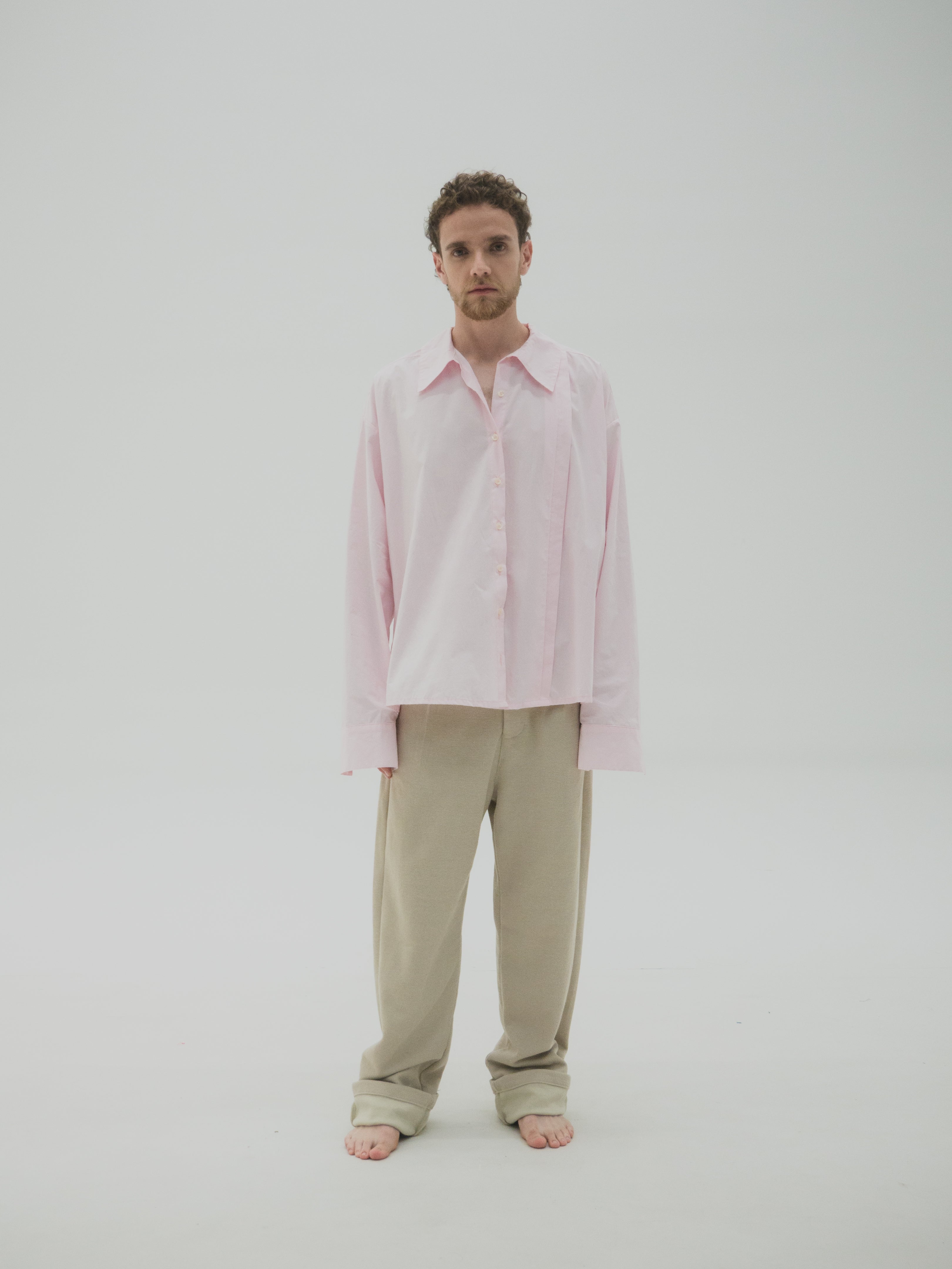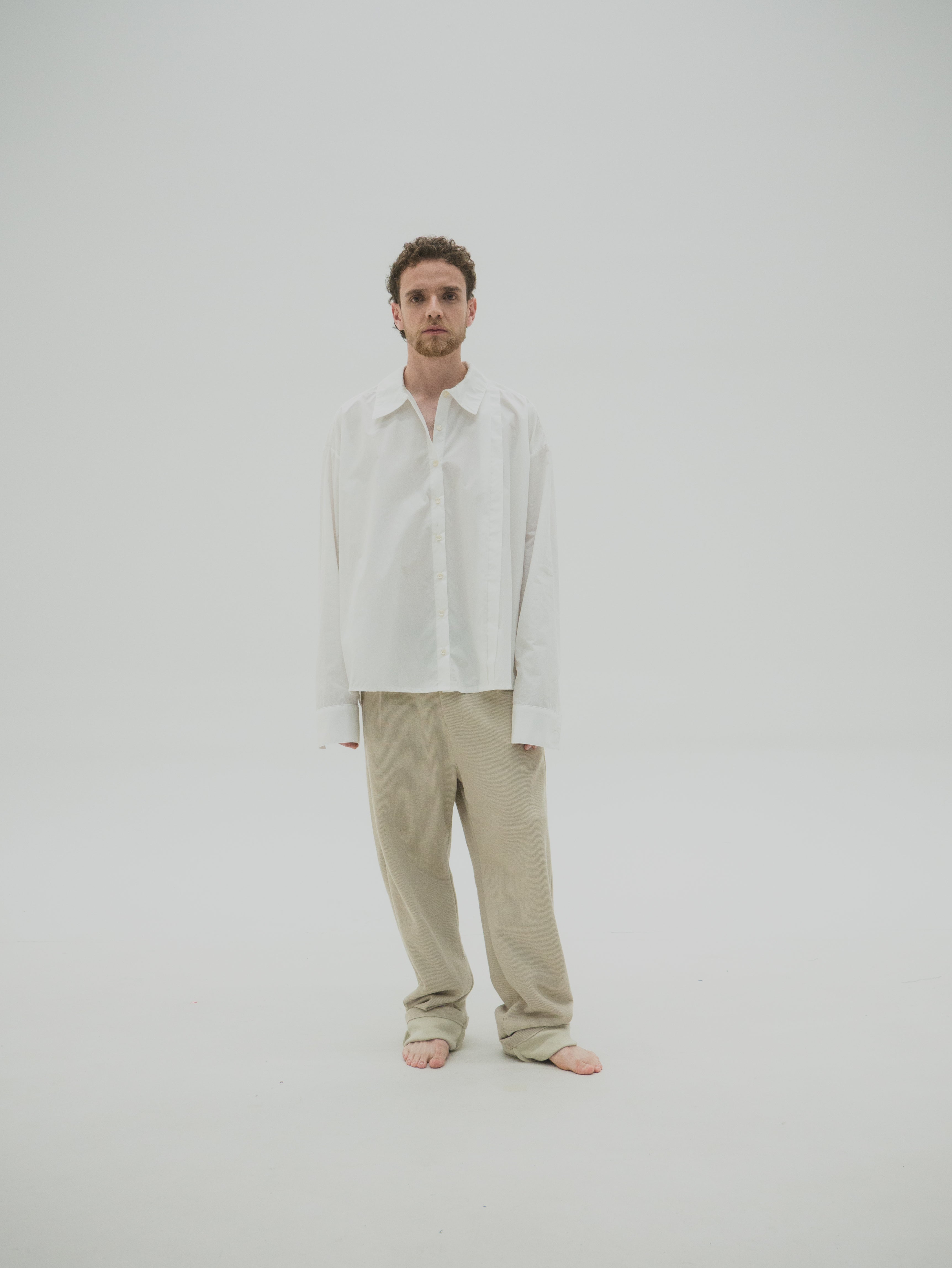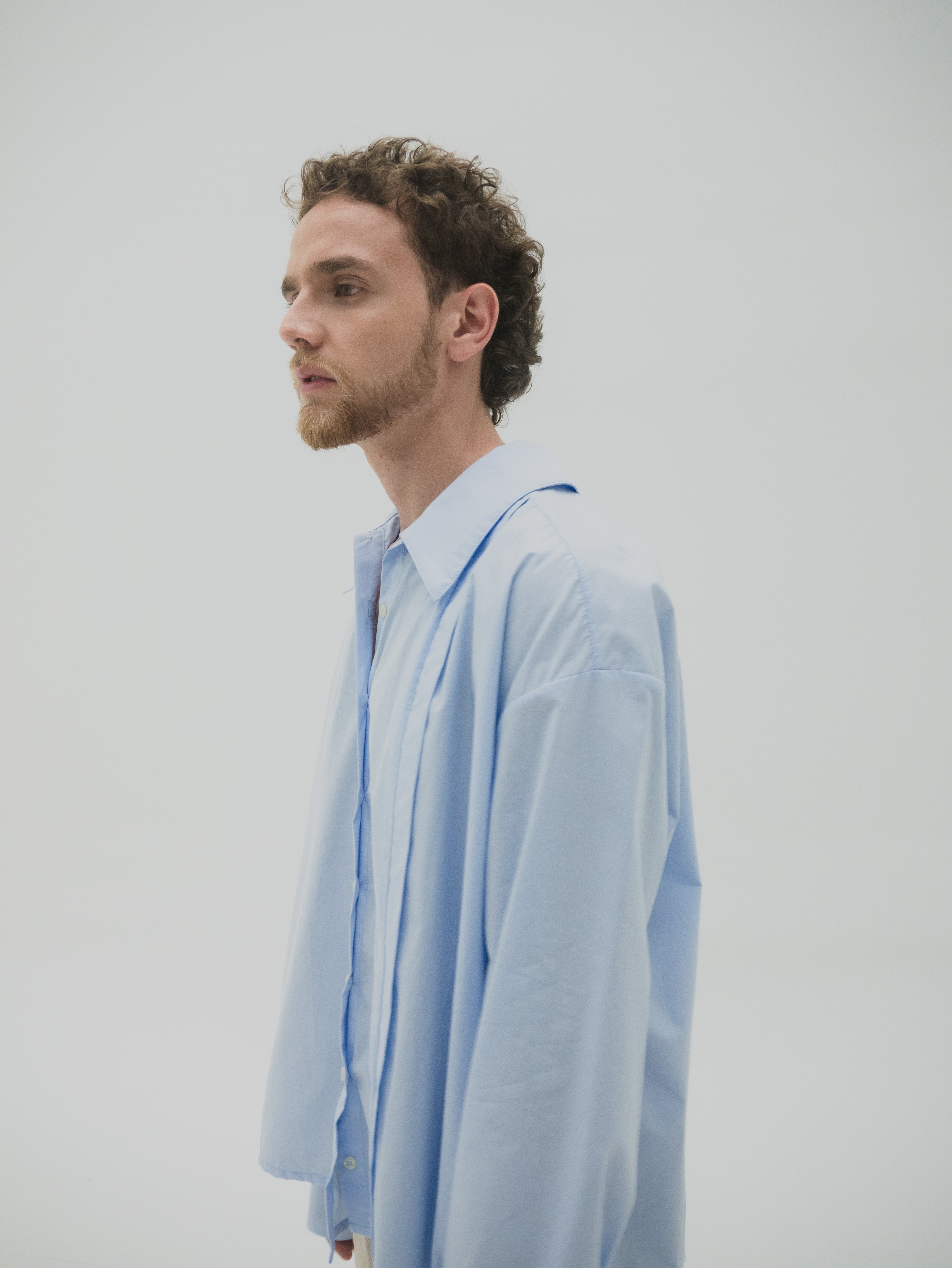 Camisa manga larga con estructura simétrica y silueta ligera. Presenta doble cuello, uno fijo en el espaldar y uno funcional en la parte frontal. Incluye pliegues laterales que genera volumen moderado sin comprometer la caída de la prenda, aportando un extra en el diseño de la pieza. Hecha en algodón ecológico.