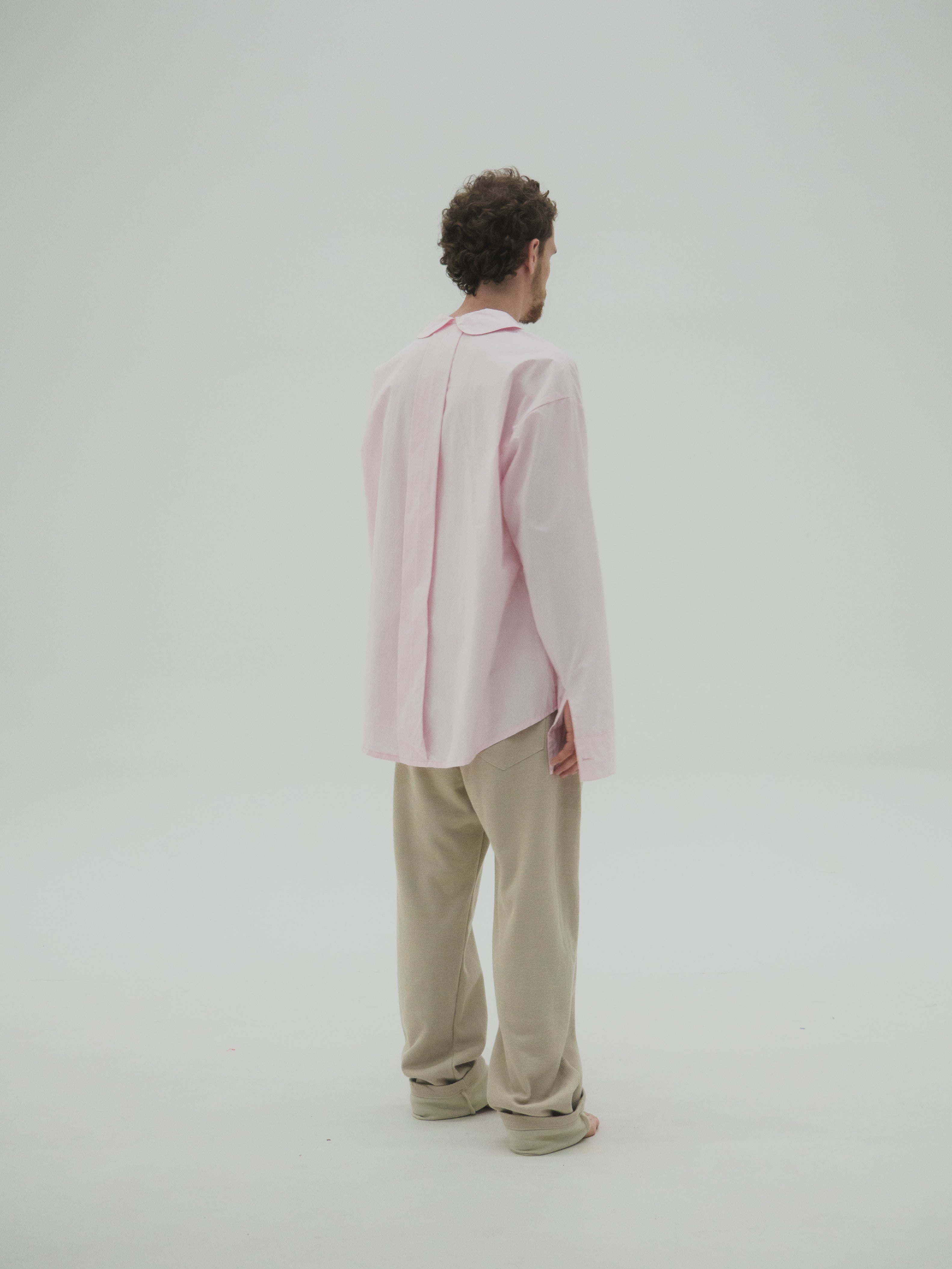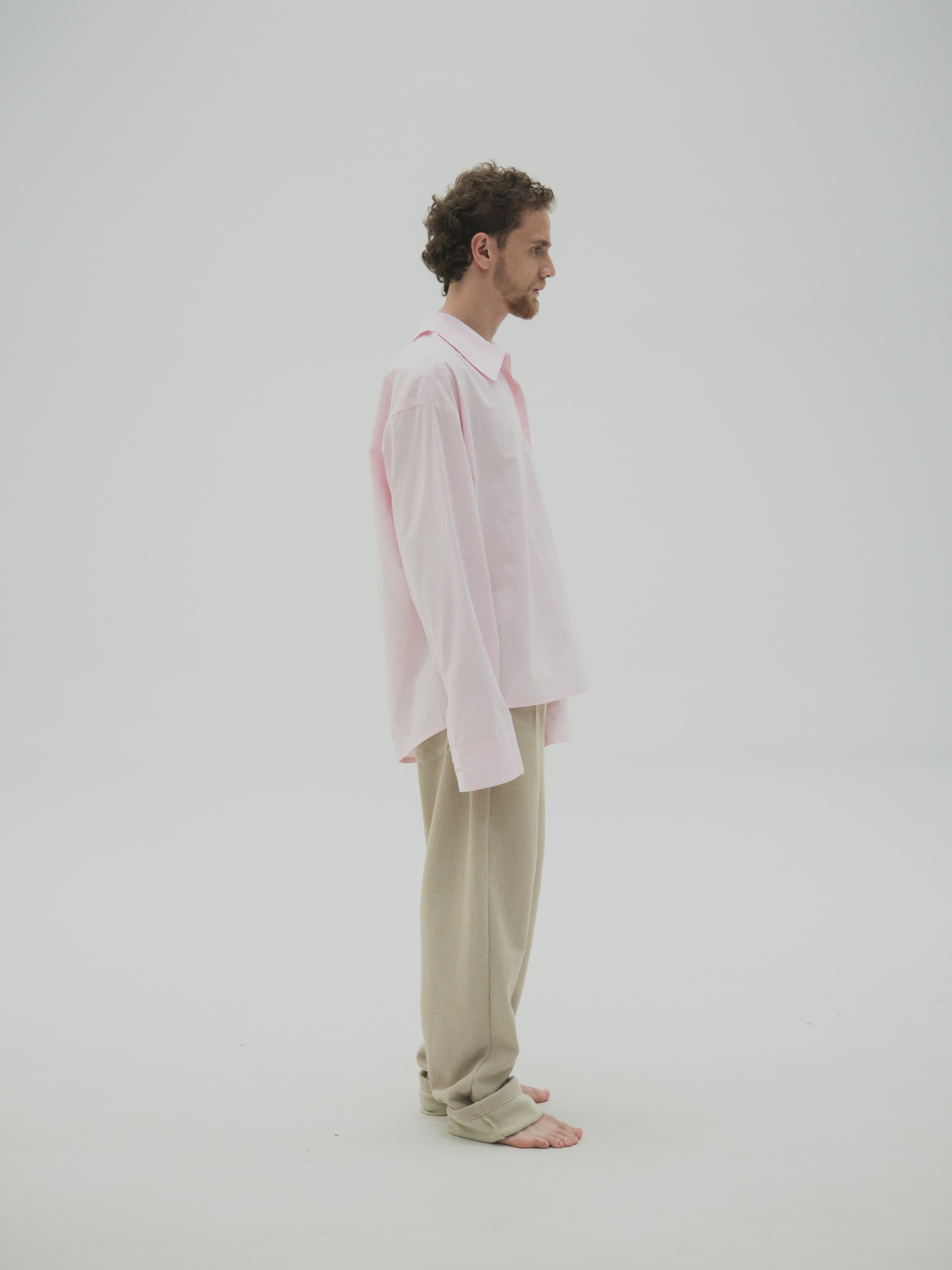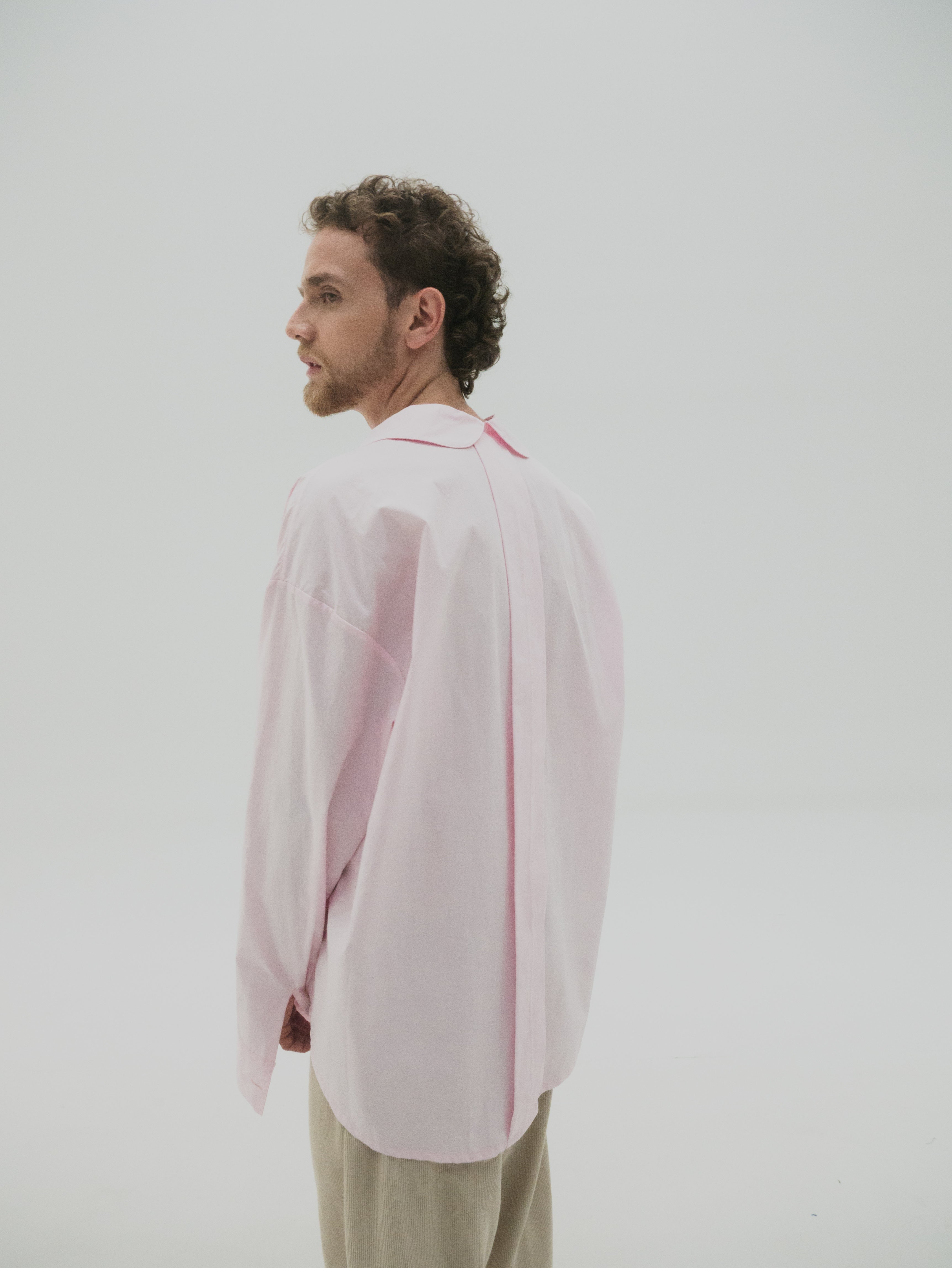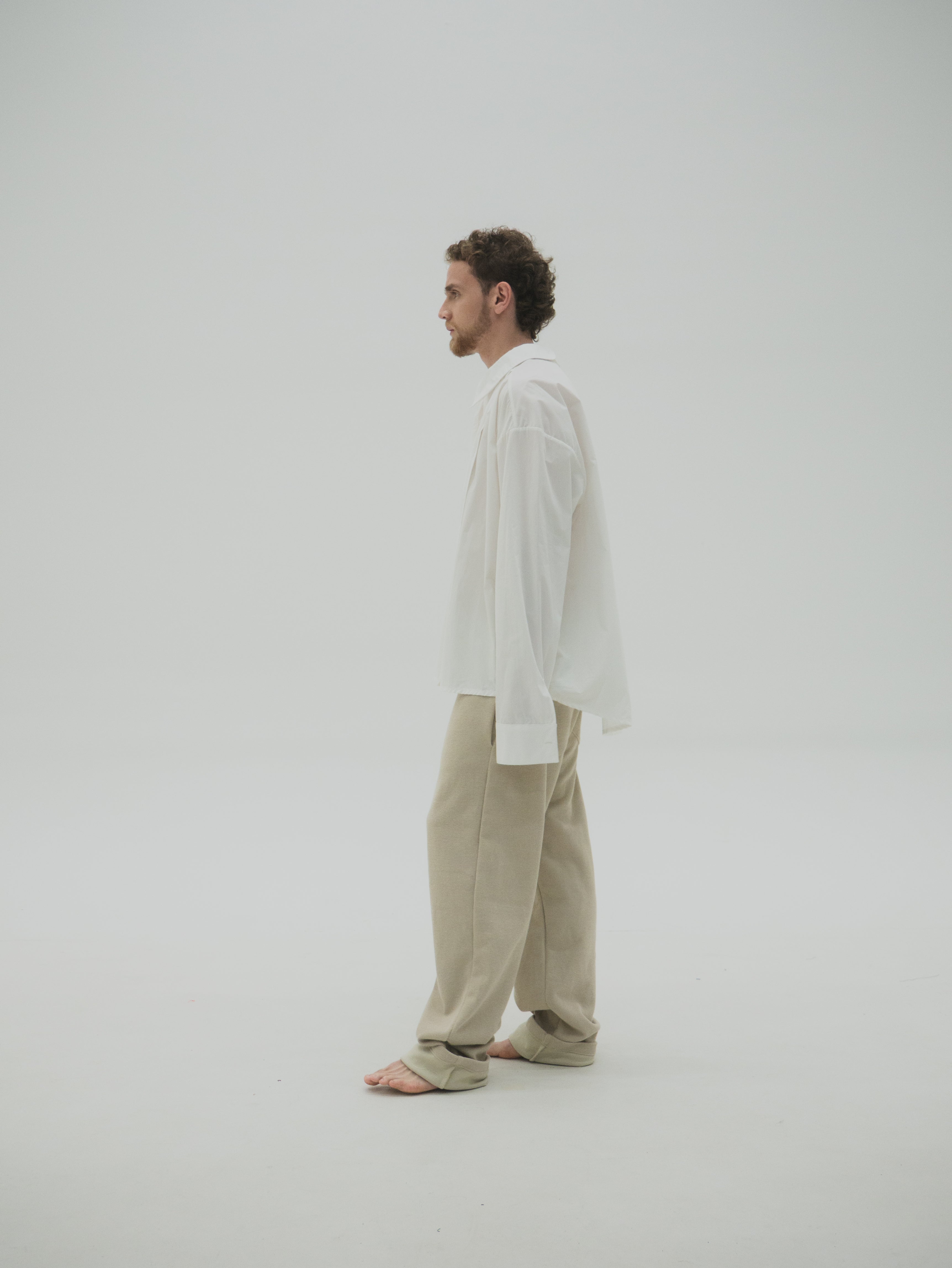 Camisa manga larga con estructura simétrica y silueta ligera. Presenta doble cuello, uno fijo en el espaldar y uno funcional en la parte frontal. Incluye pliegues laterales que genera volumen moderado sin comprometer la caída de la prenda, aportando un extra en el diseño de la pieza. Hecha en algodón ecológico.