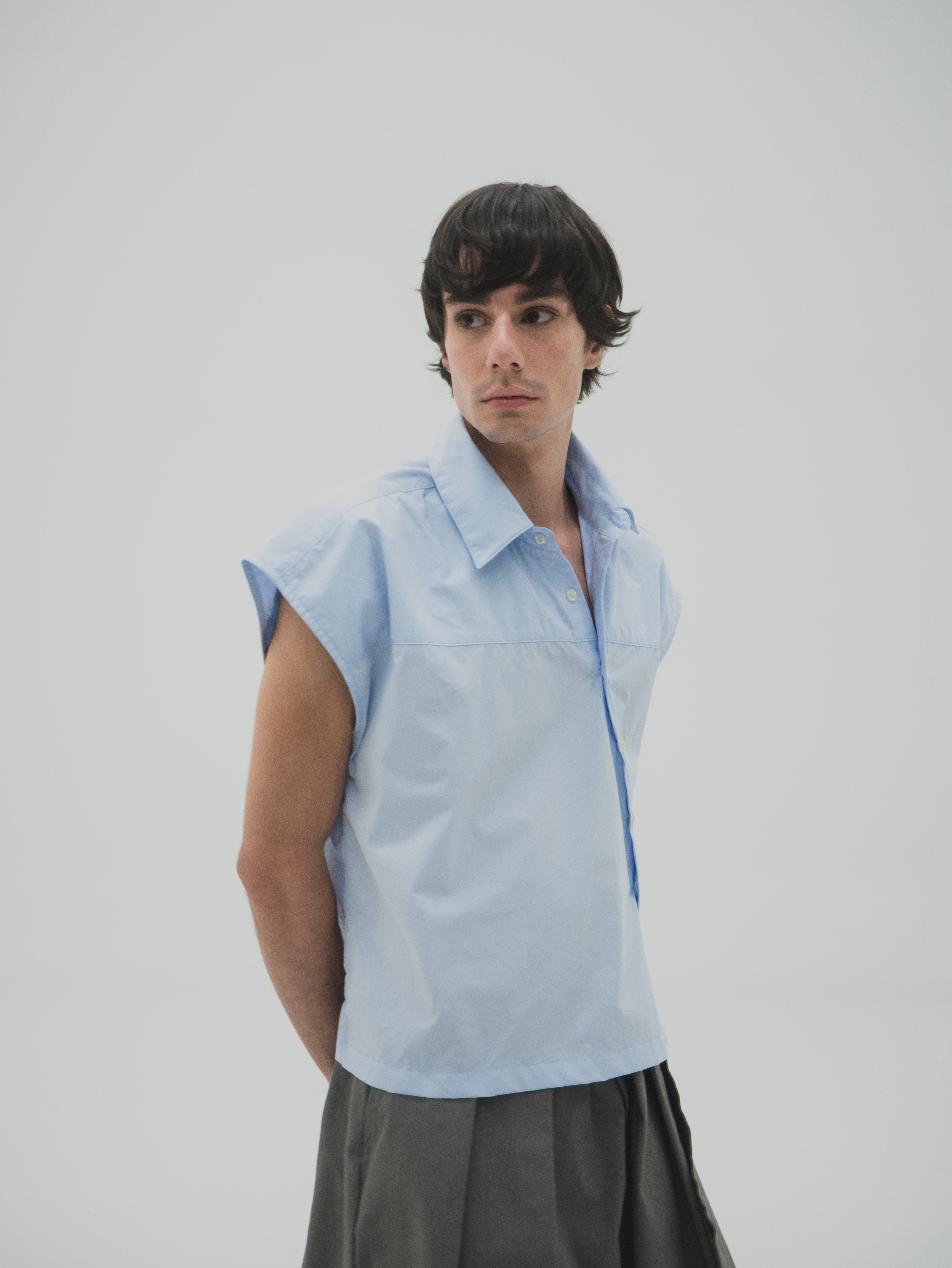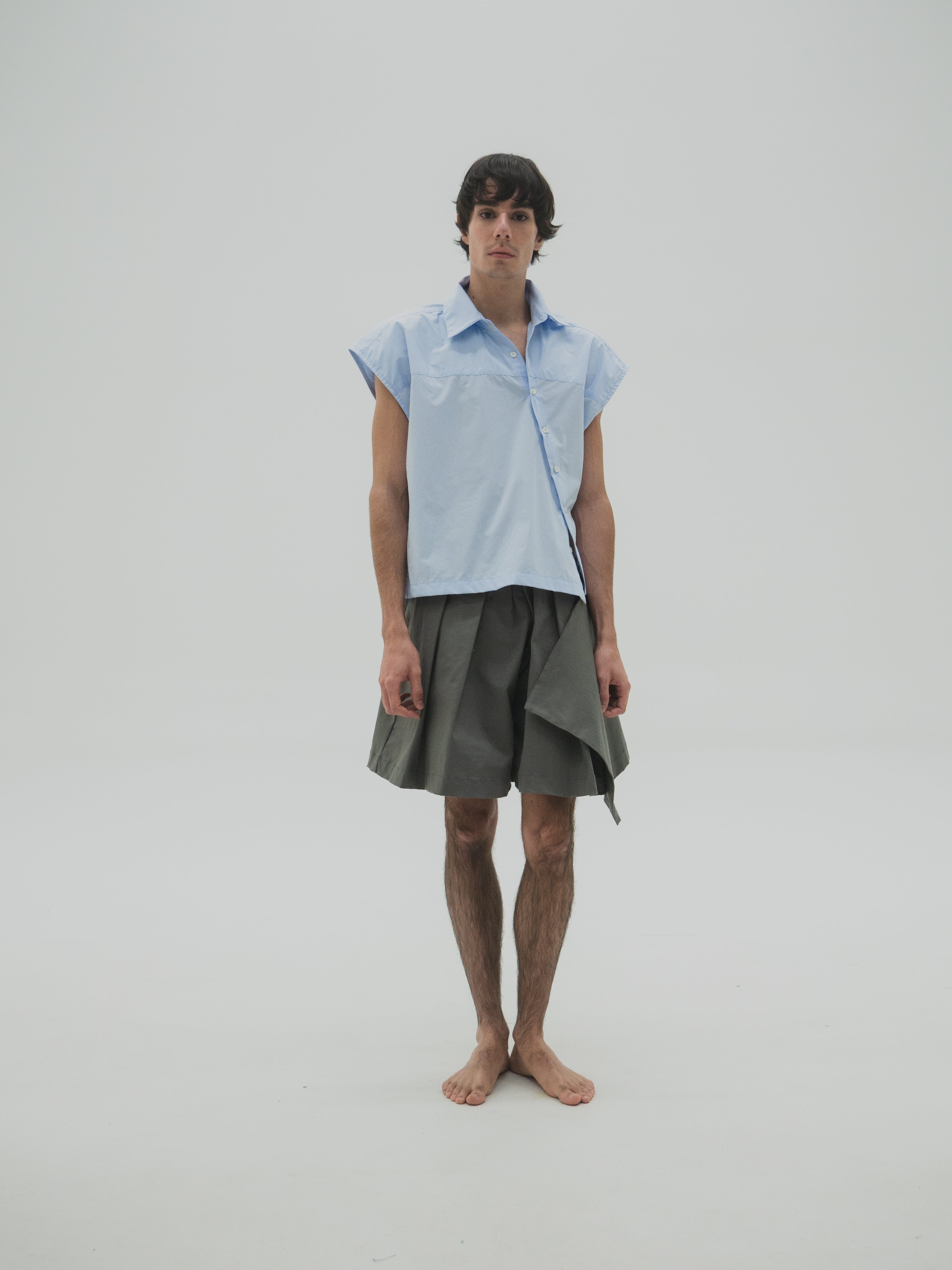 Camisa estructurada con manga sisa y de corte tipo boxy, con botonadura cruzada en diagonal.