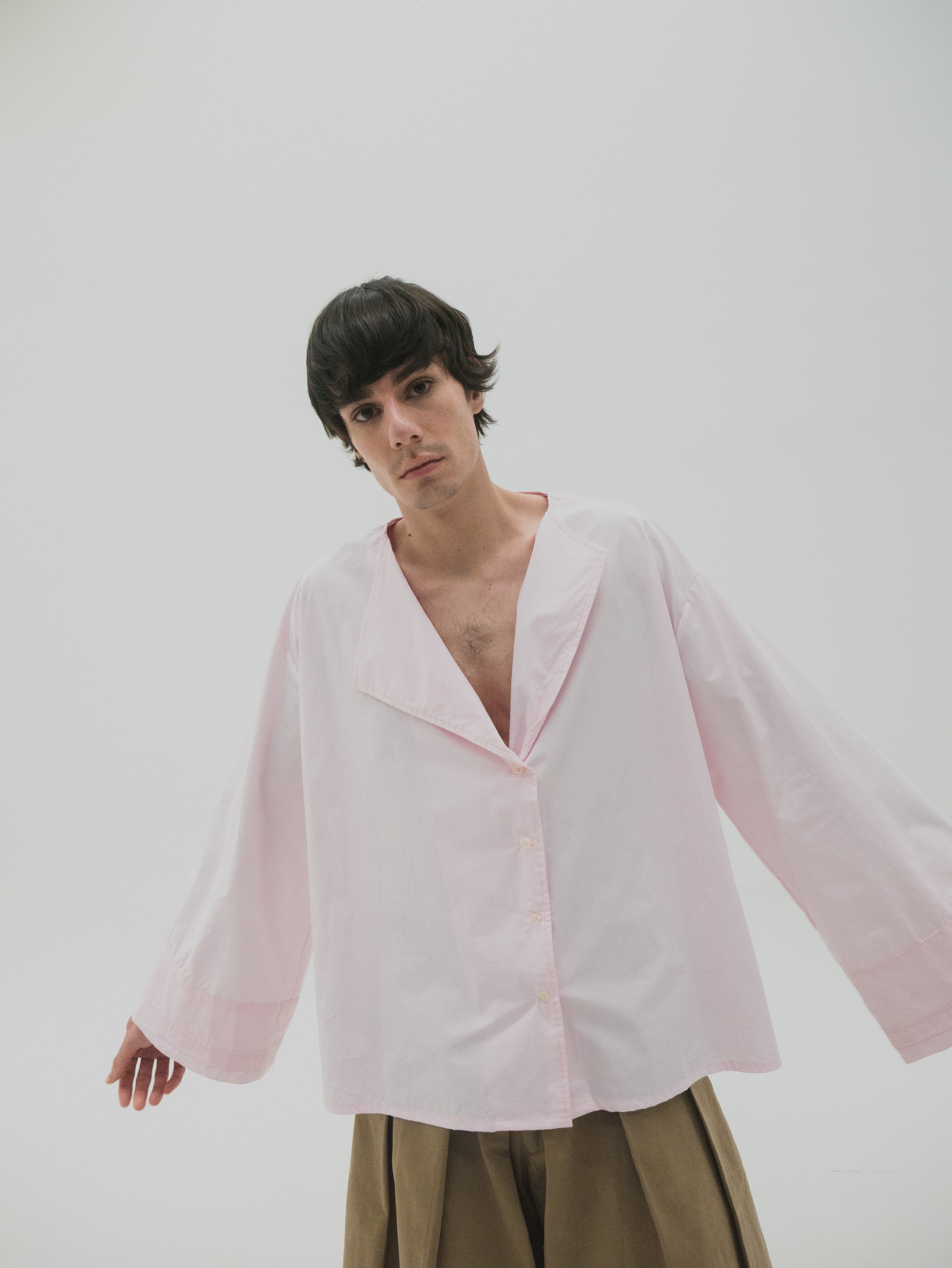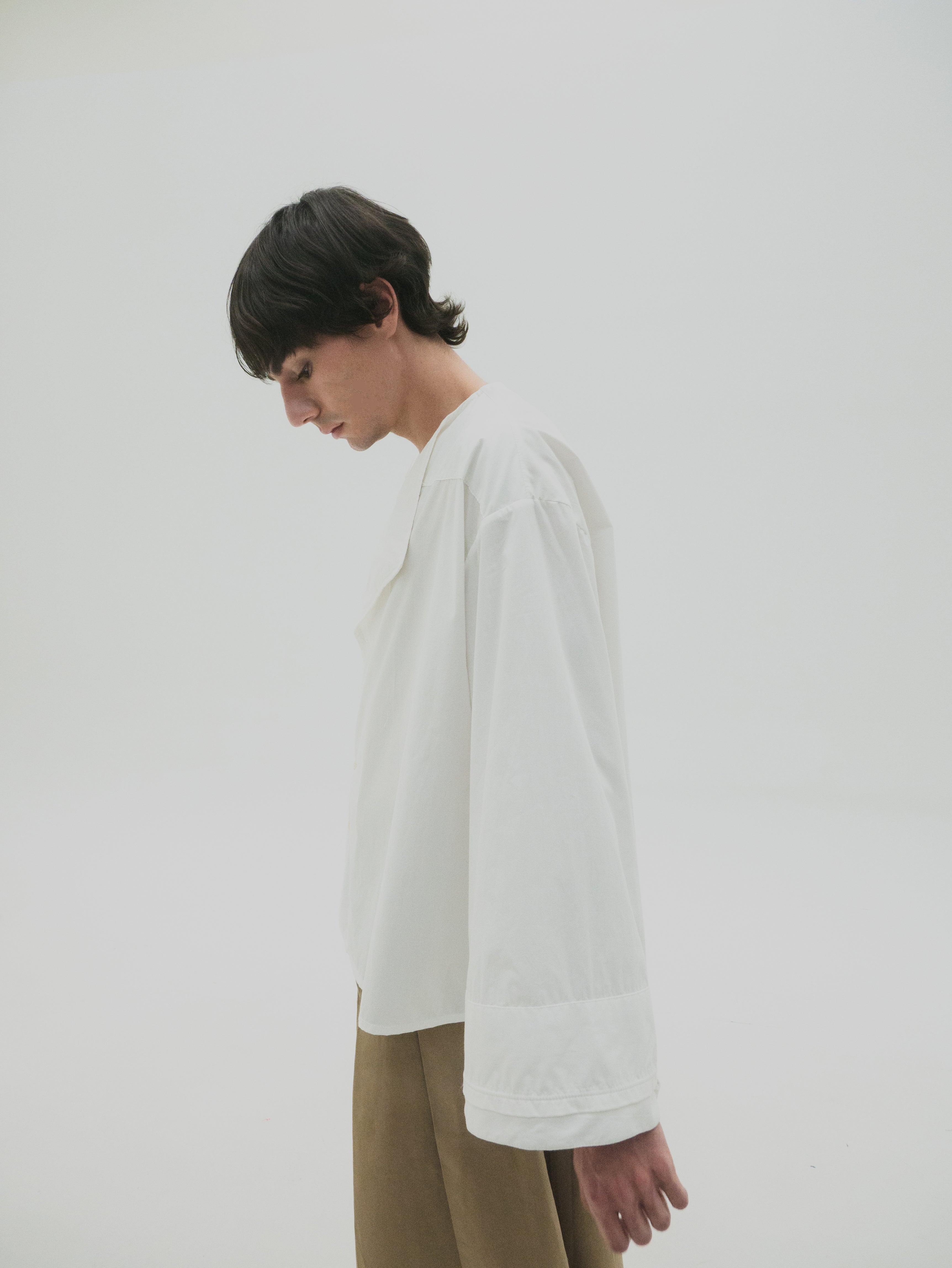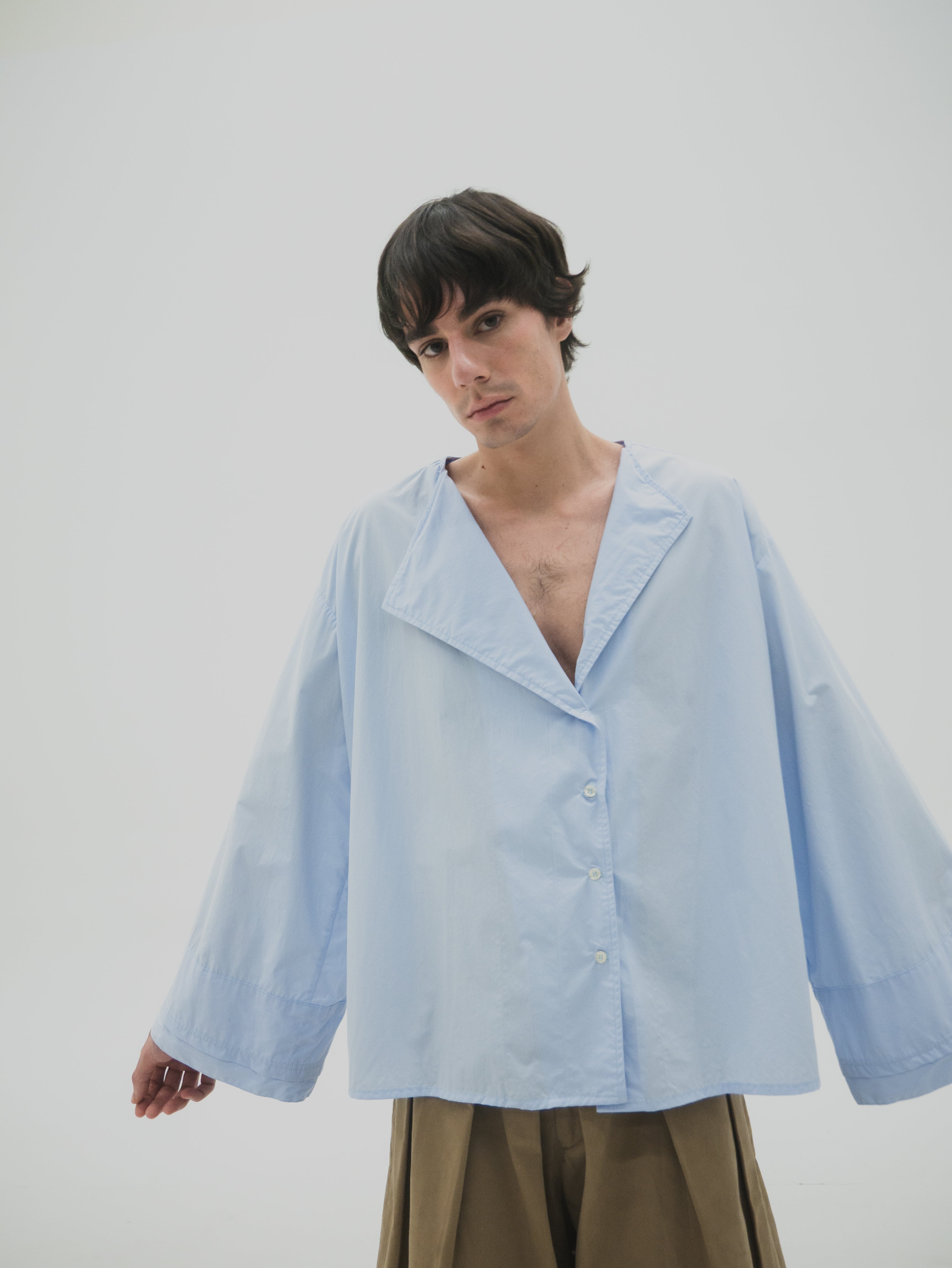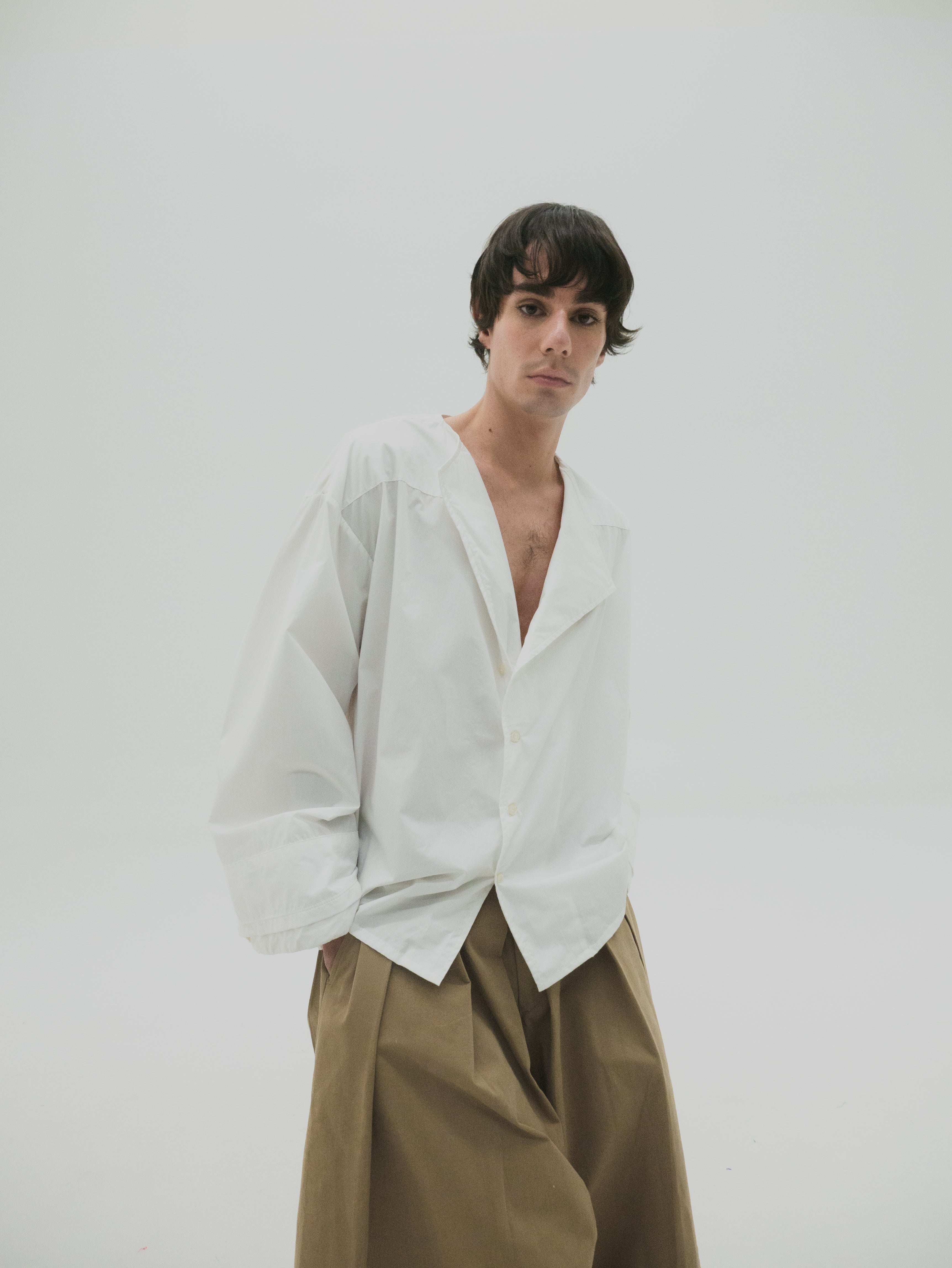 Camisa de corte oversize con estructura simétrica en el cuerpo. Presenta mangas con volumen y puños dobles que generan un efecto de capas. El cuello es asimétrico, diseñado con diferencia de altura entre ambos lados, integrando una variación sutil dentro de una base funcional.