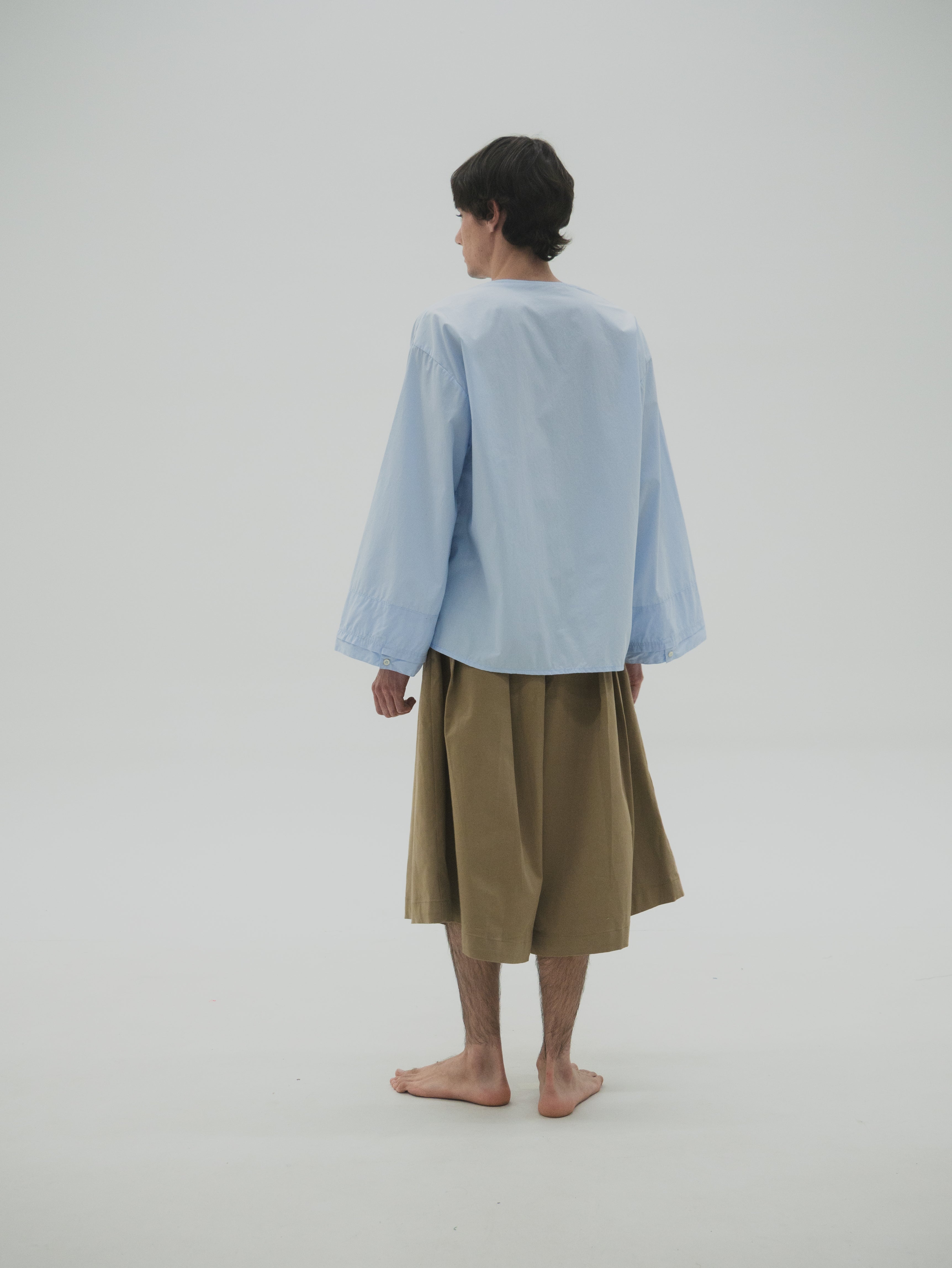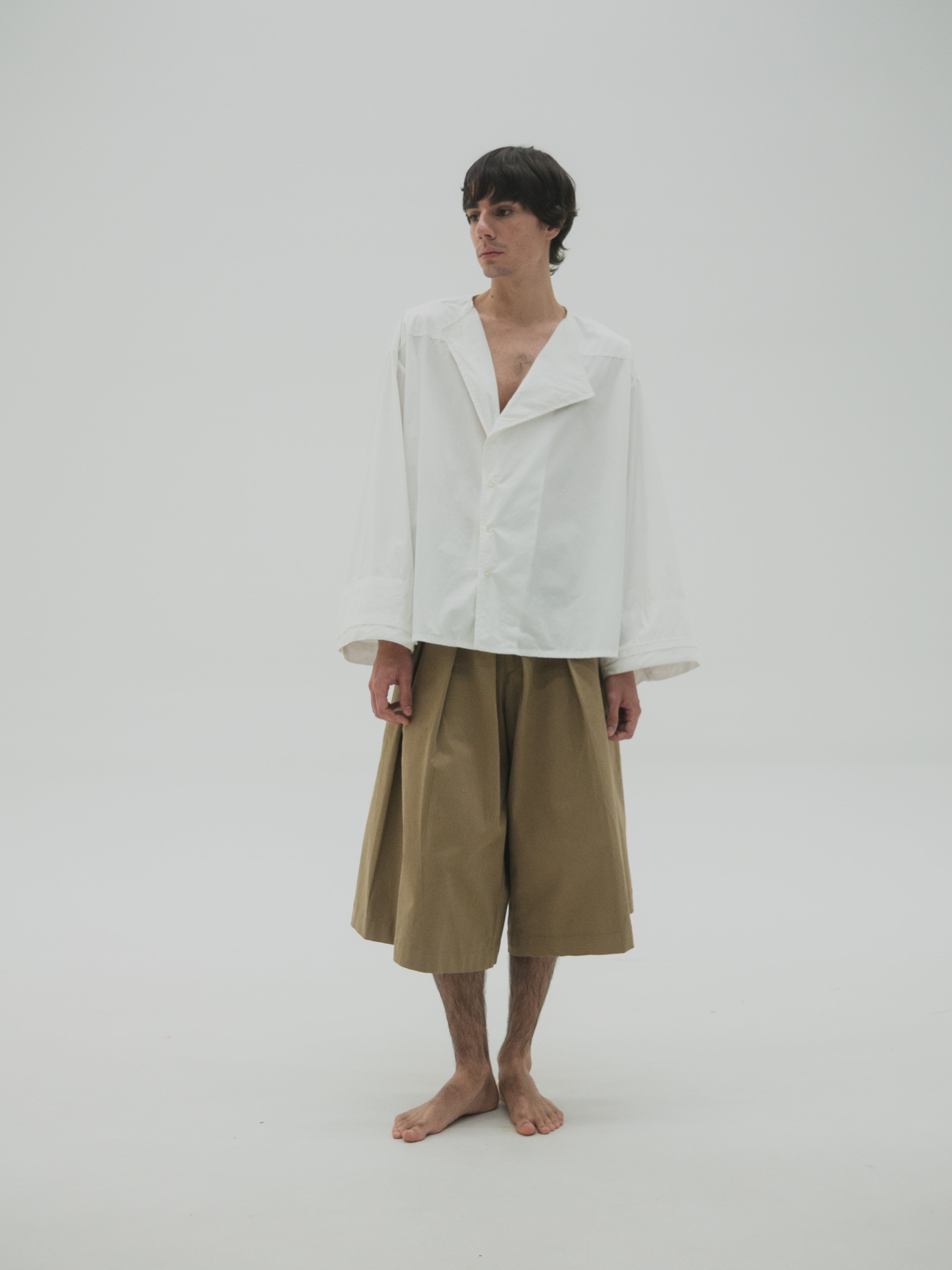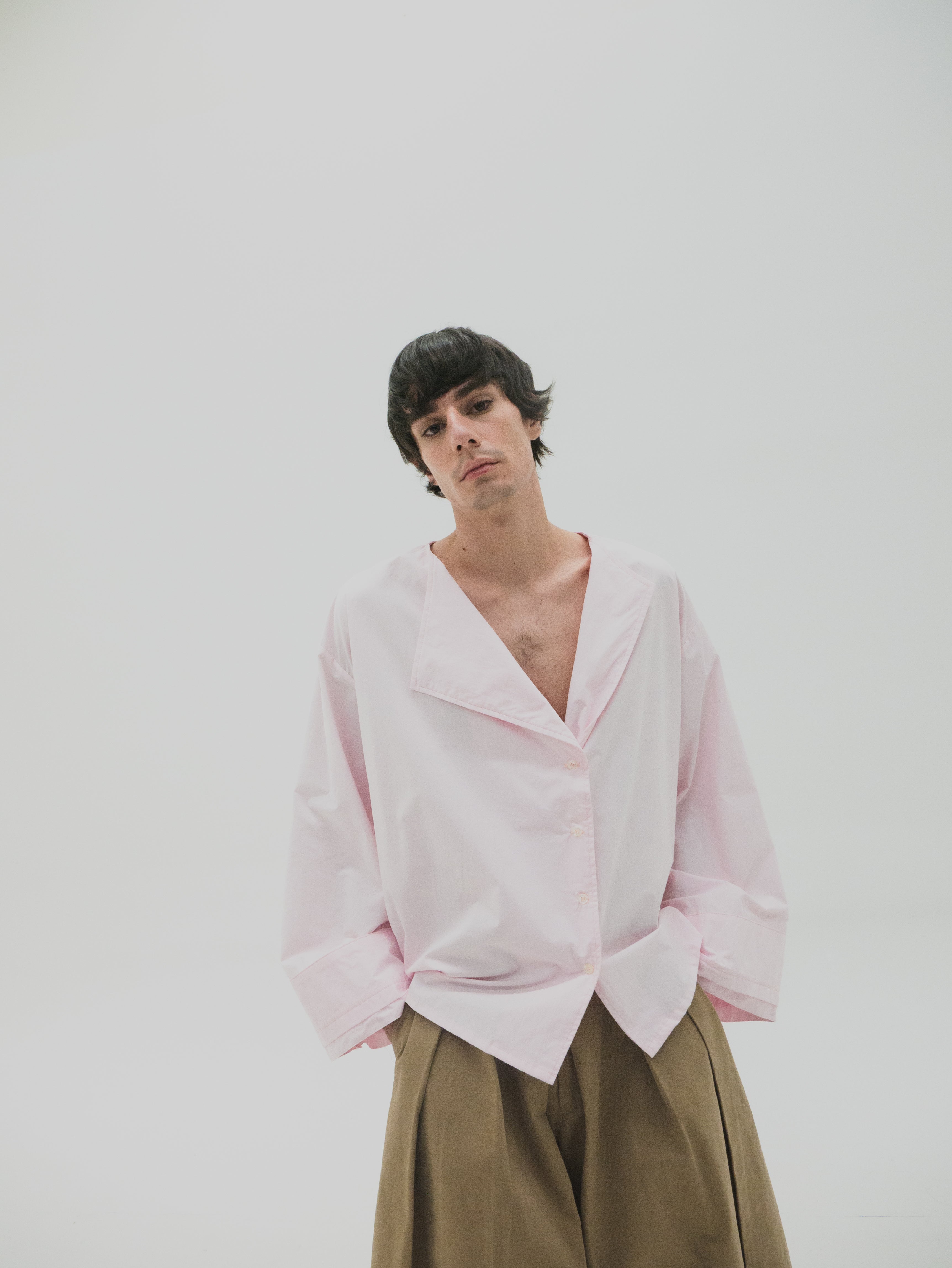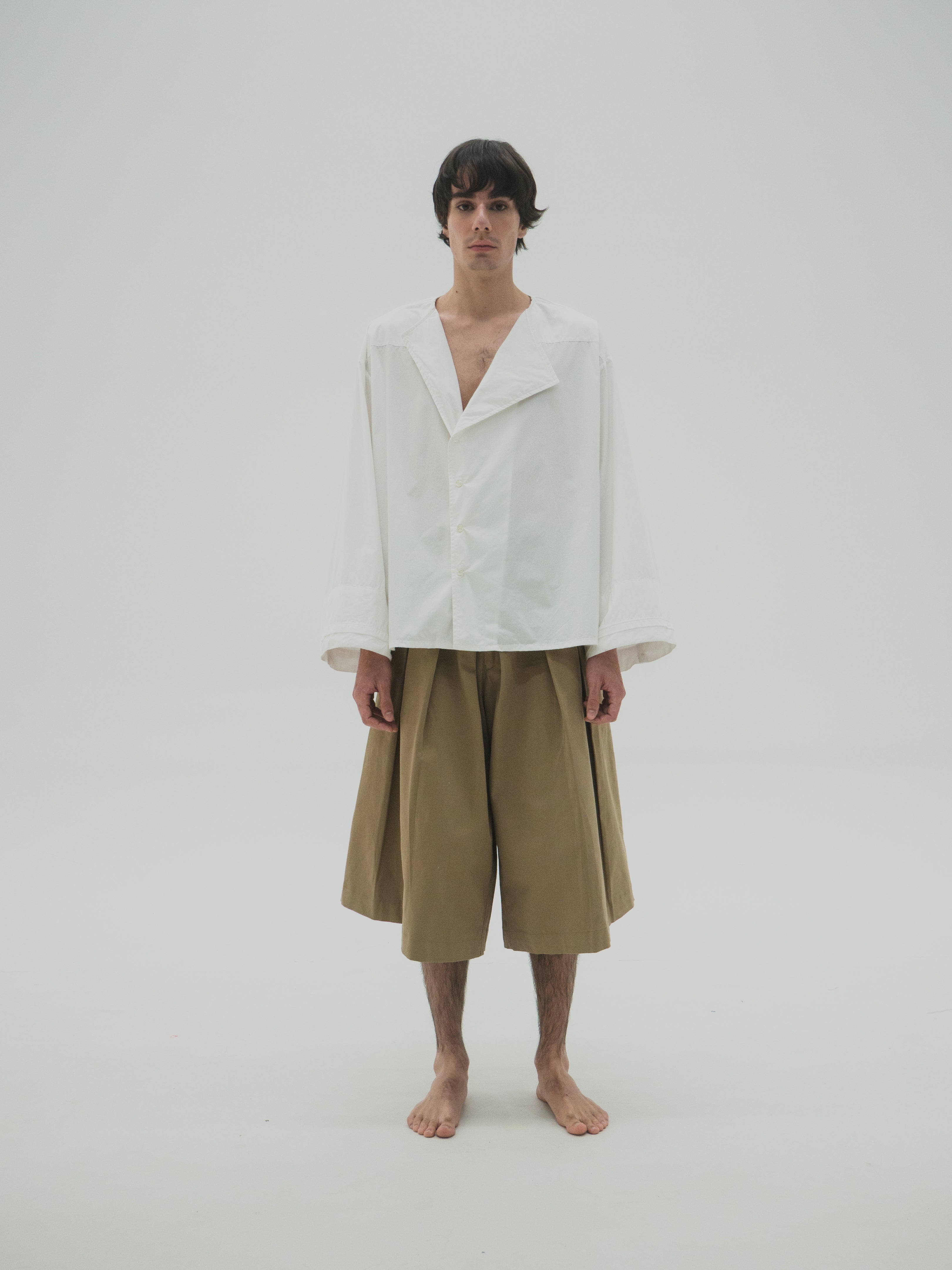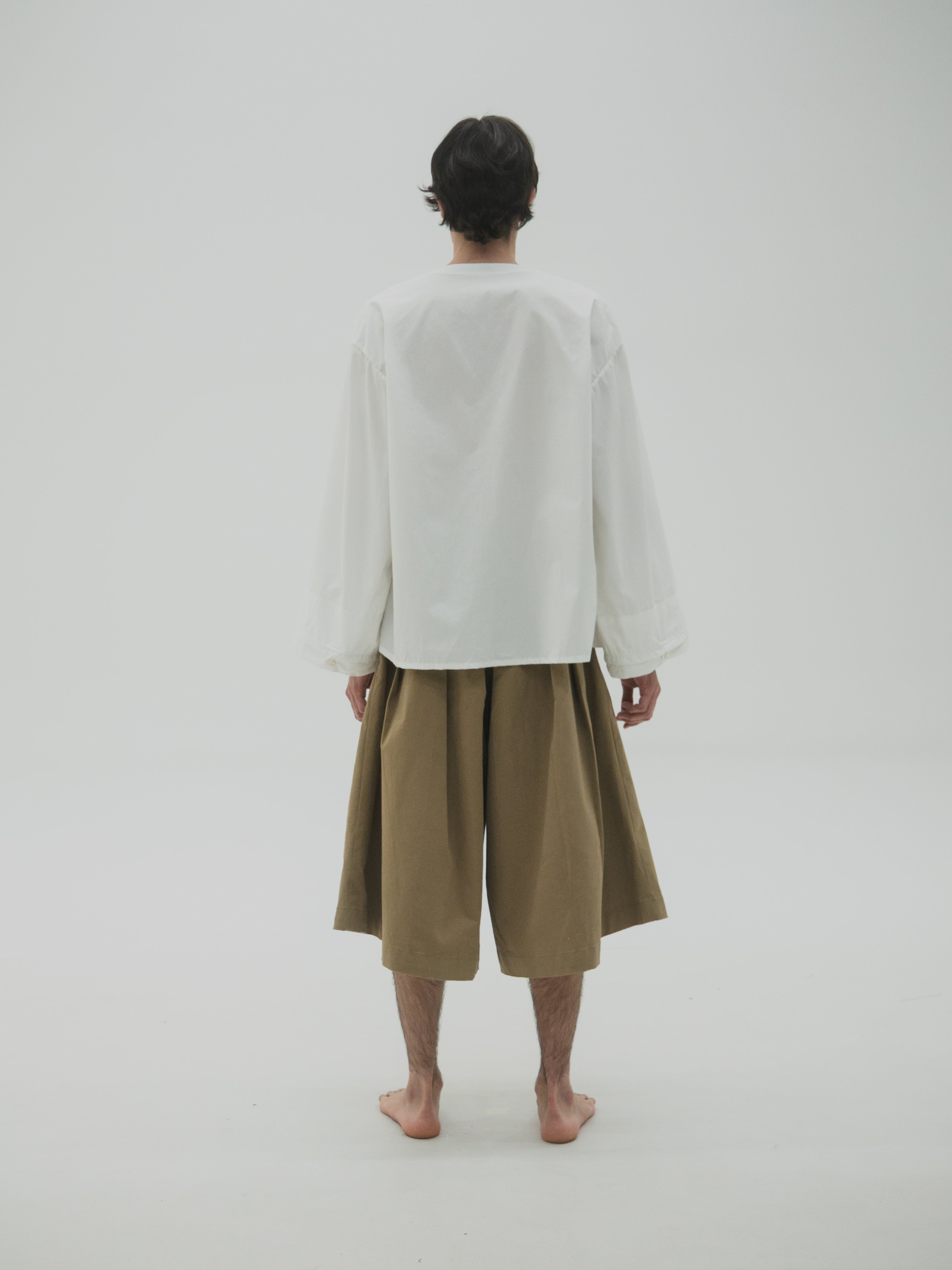 Camisa de corte oversize con estructura simétrica en el cuerpo. Presenta mangas con volumen y puños dobles que generan un efecto de capas. El cuello es asimétrico, diseñado con diferencia de altura entre ambos lados, integrando una variación sutil dentro de una base funcional.