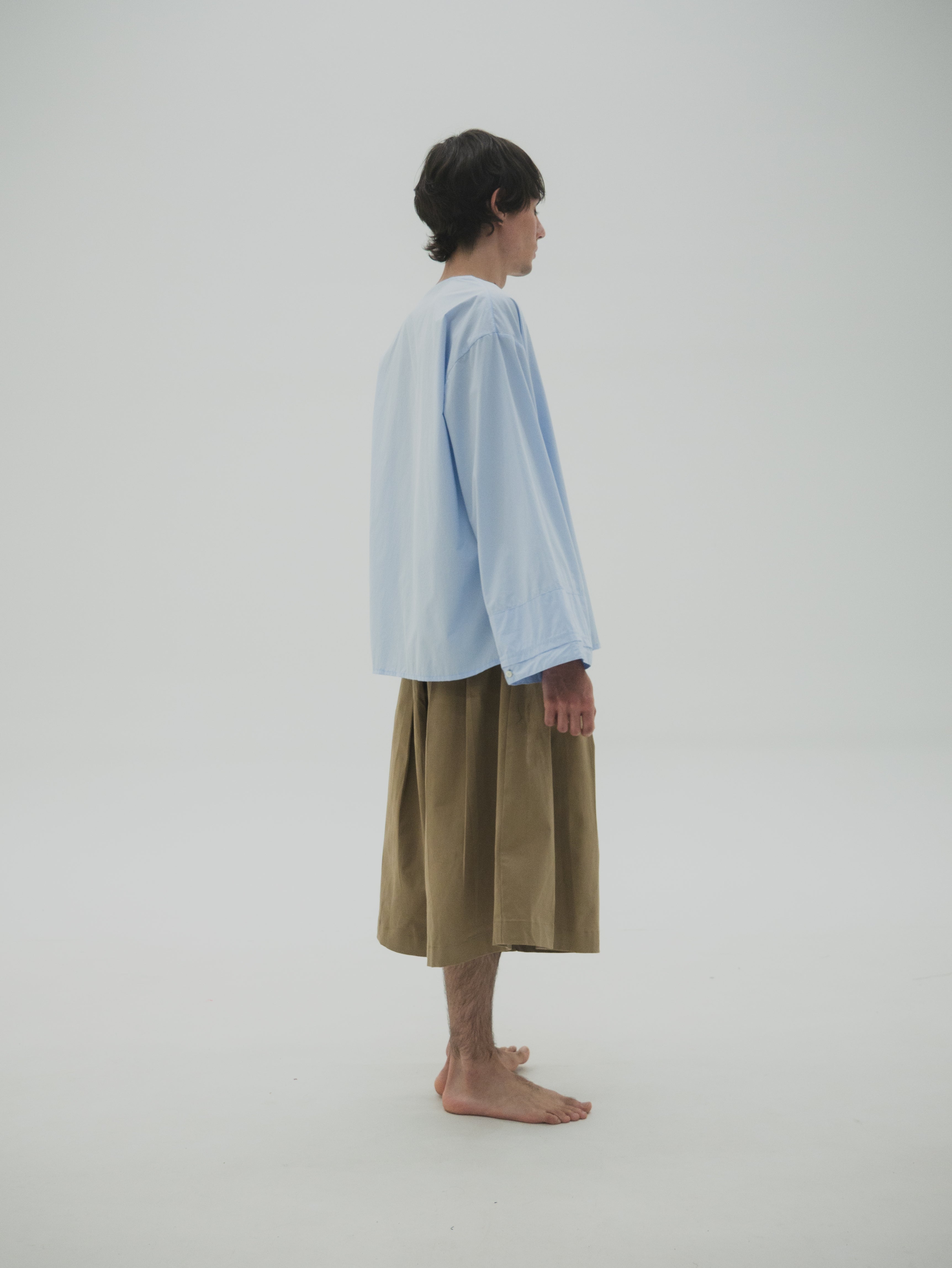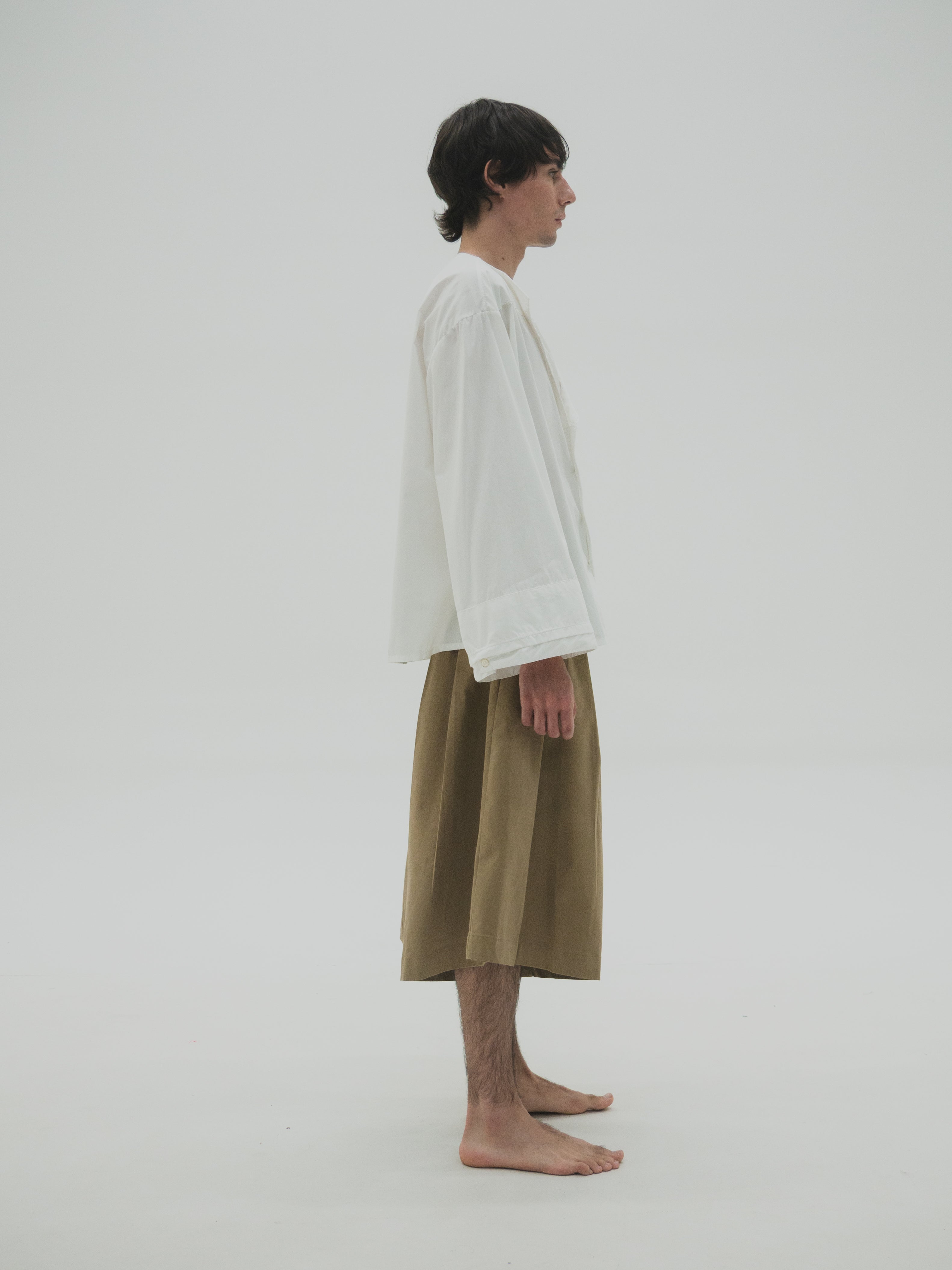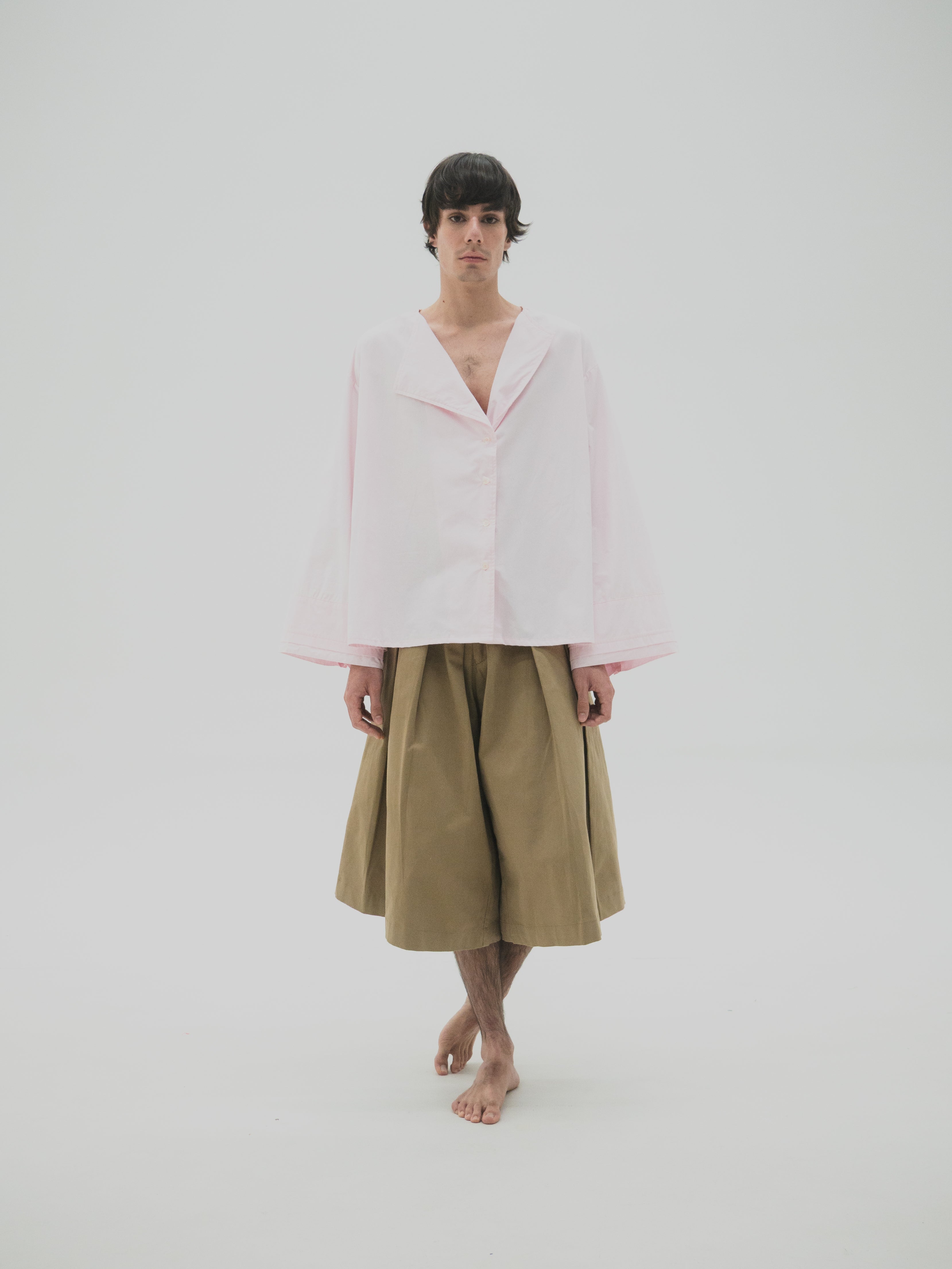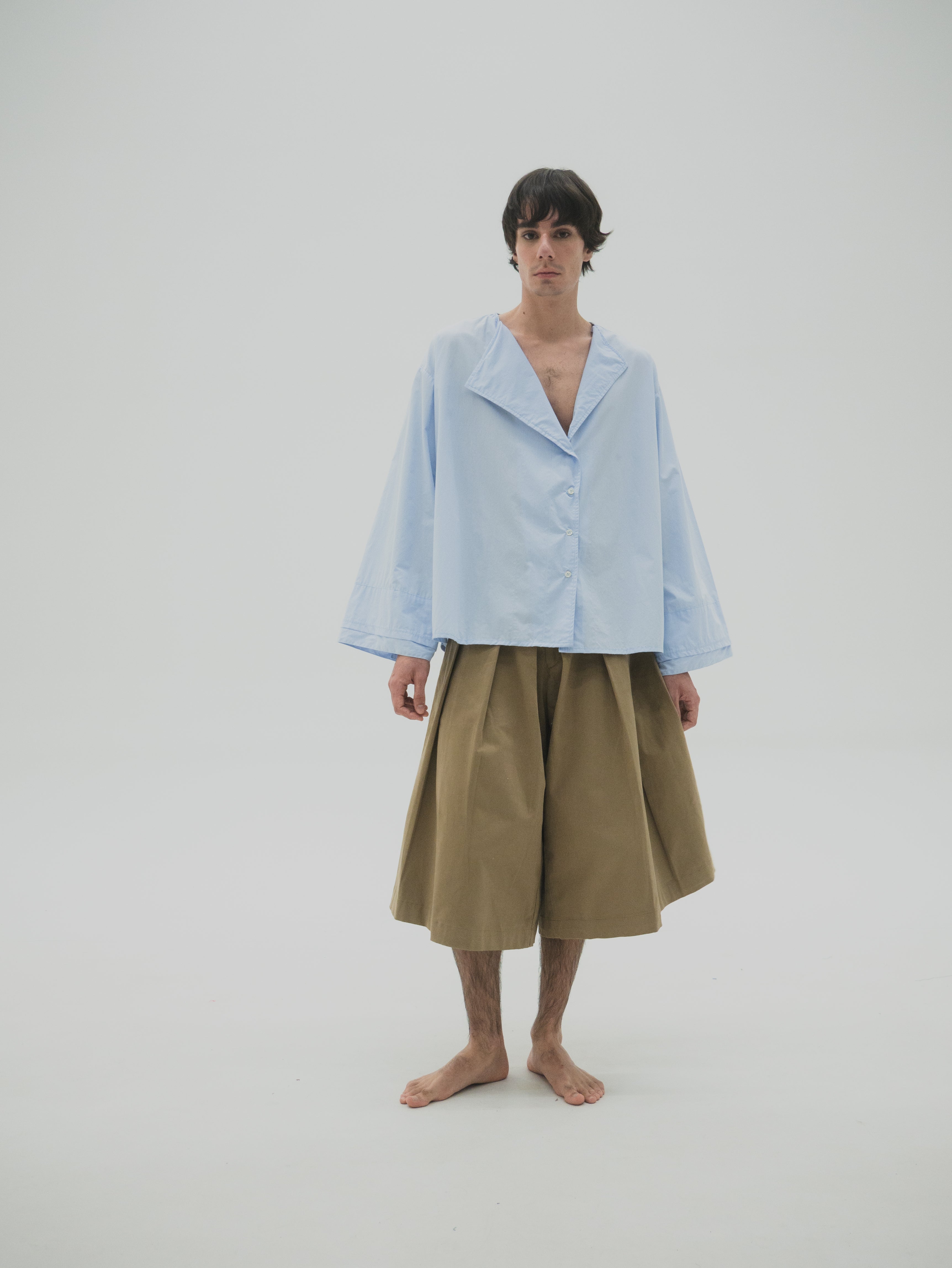Camisa de corte oversize con estructura simétrica en el cuerpo. Presenta mangas con volumen y puños dobles que generan un efecto de capas. El cuello es asimétrico, diseñado con diferencia de altura entre ambos lados, integrando una variación sutil dentro de una base funcional.