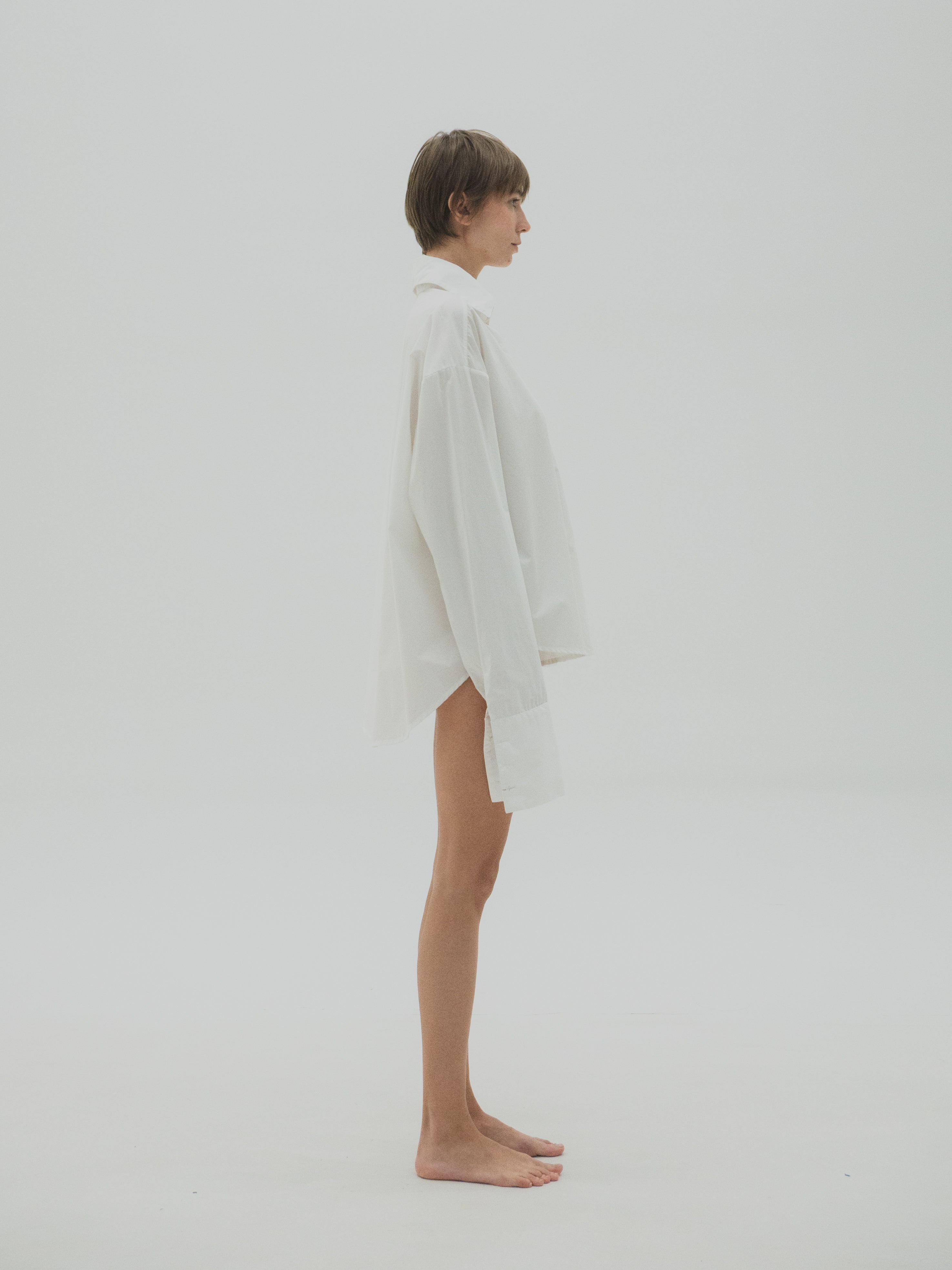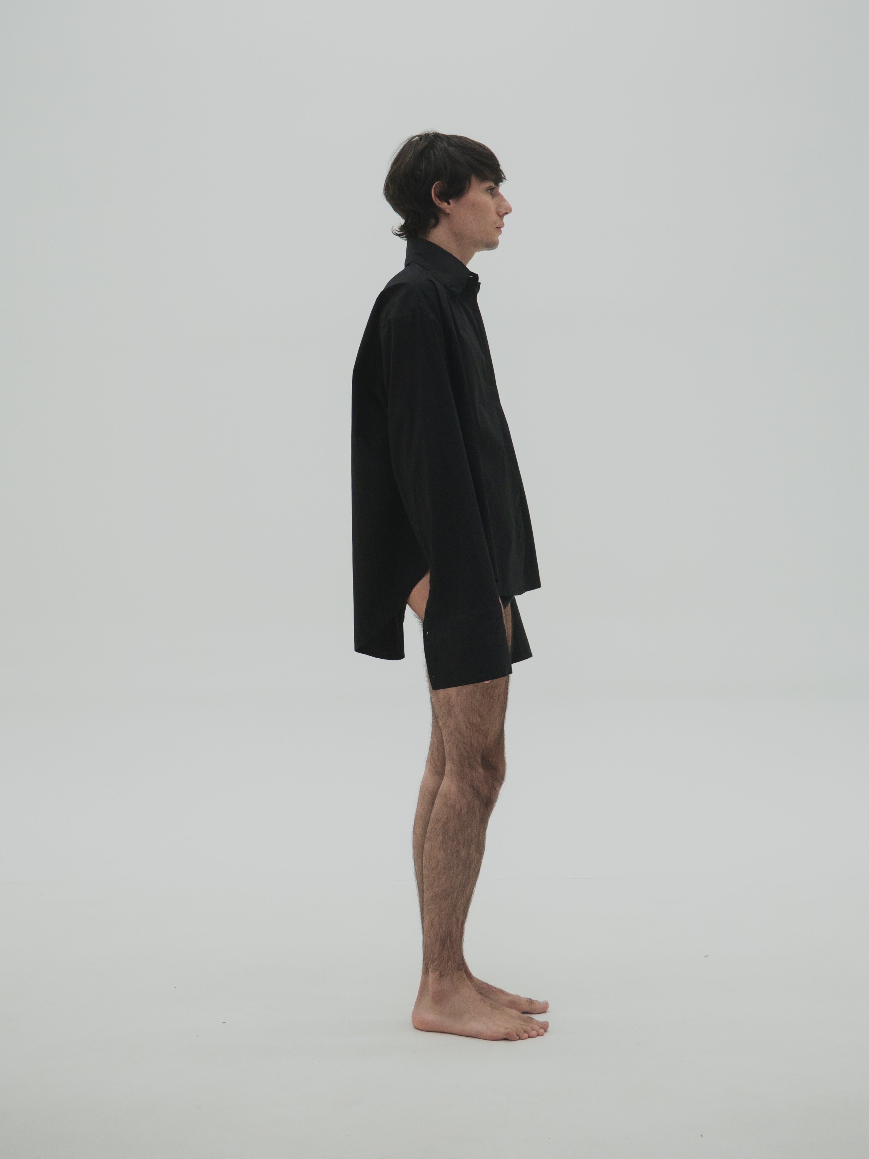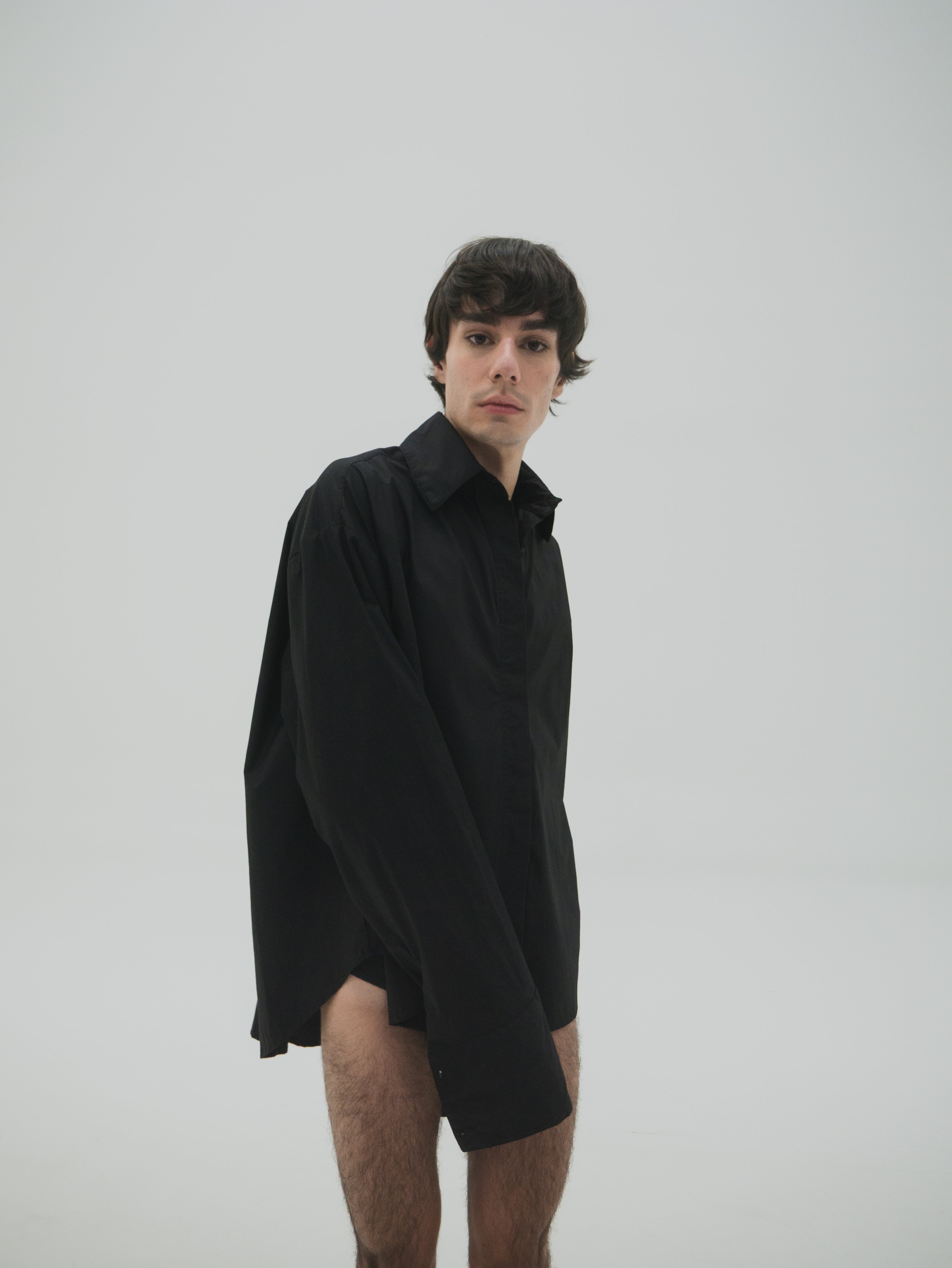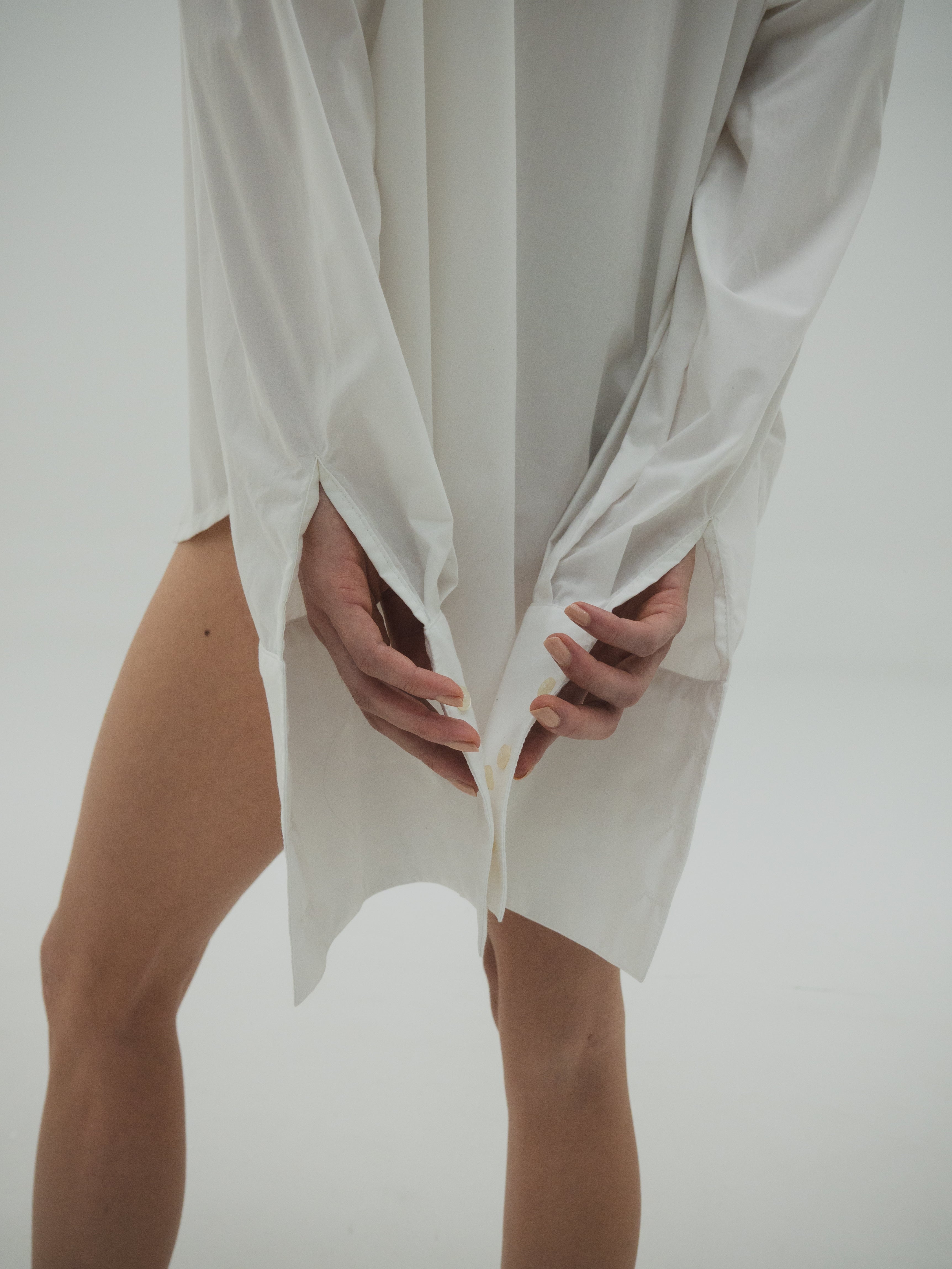 Camisa de estructura simétrica, confeccionada en algodón 100%. Con mangas y puños extra largos que aportan volumen a la pieza. El cuello alto añade un toque formal a una silueta ligera, equilibrando proporción y estructura con acabados limpios y funcionales.