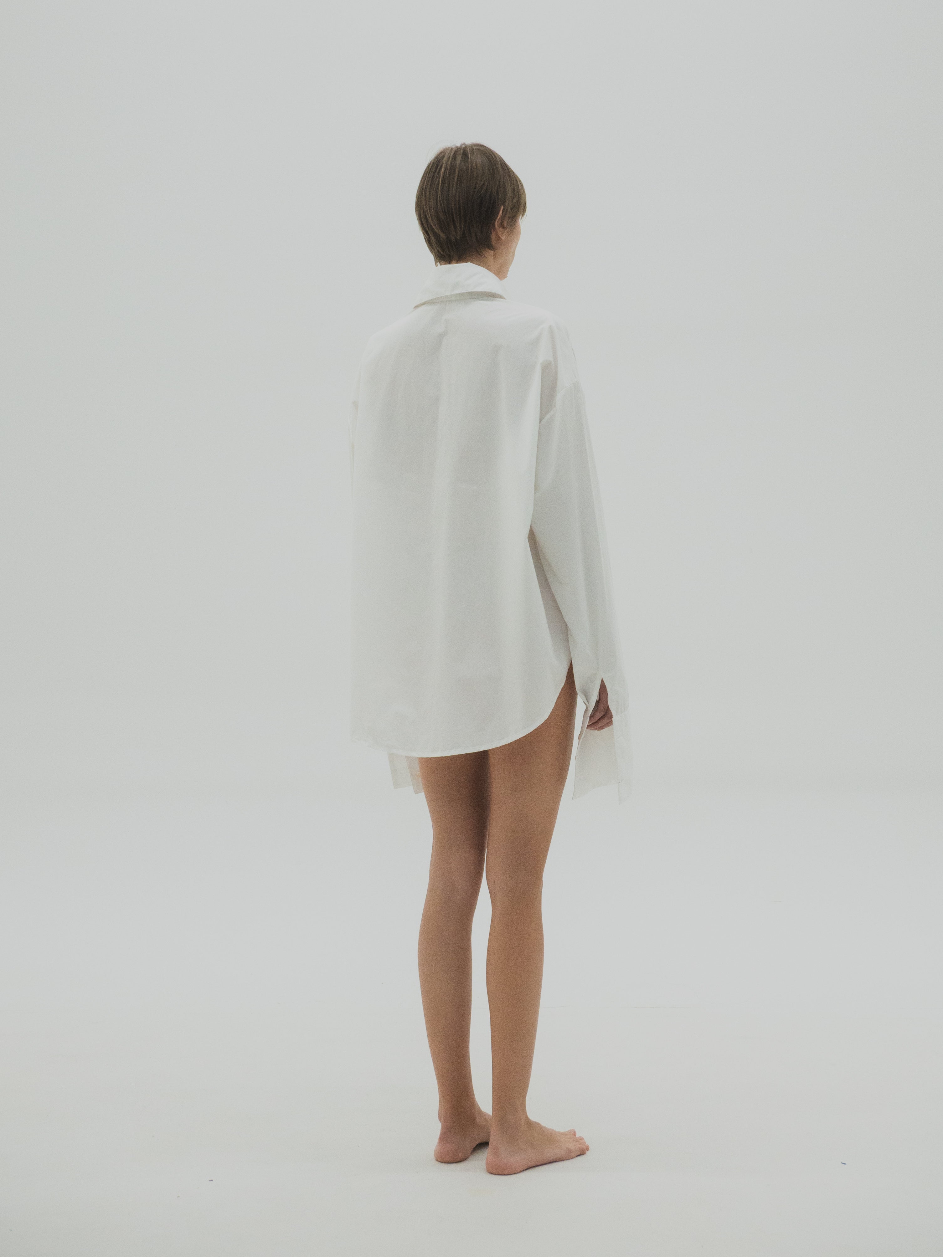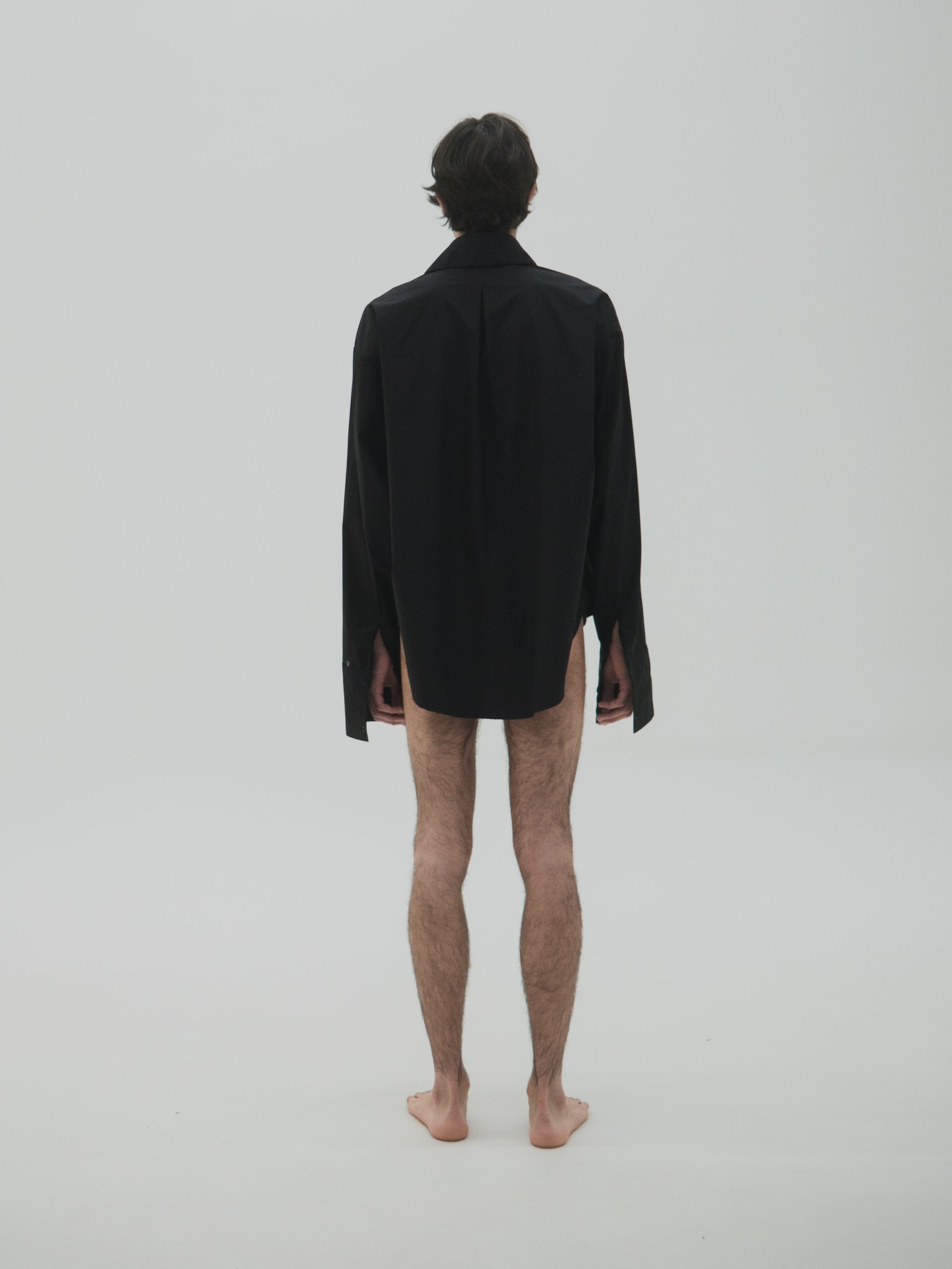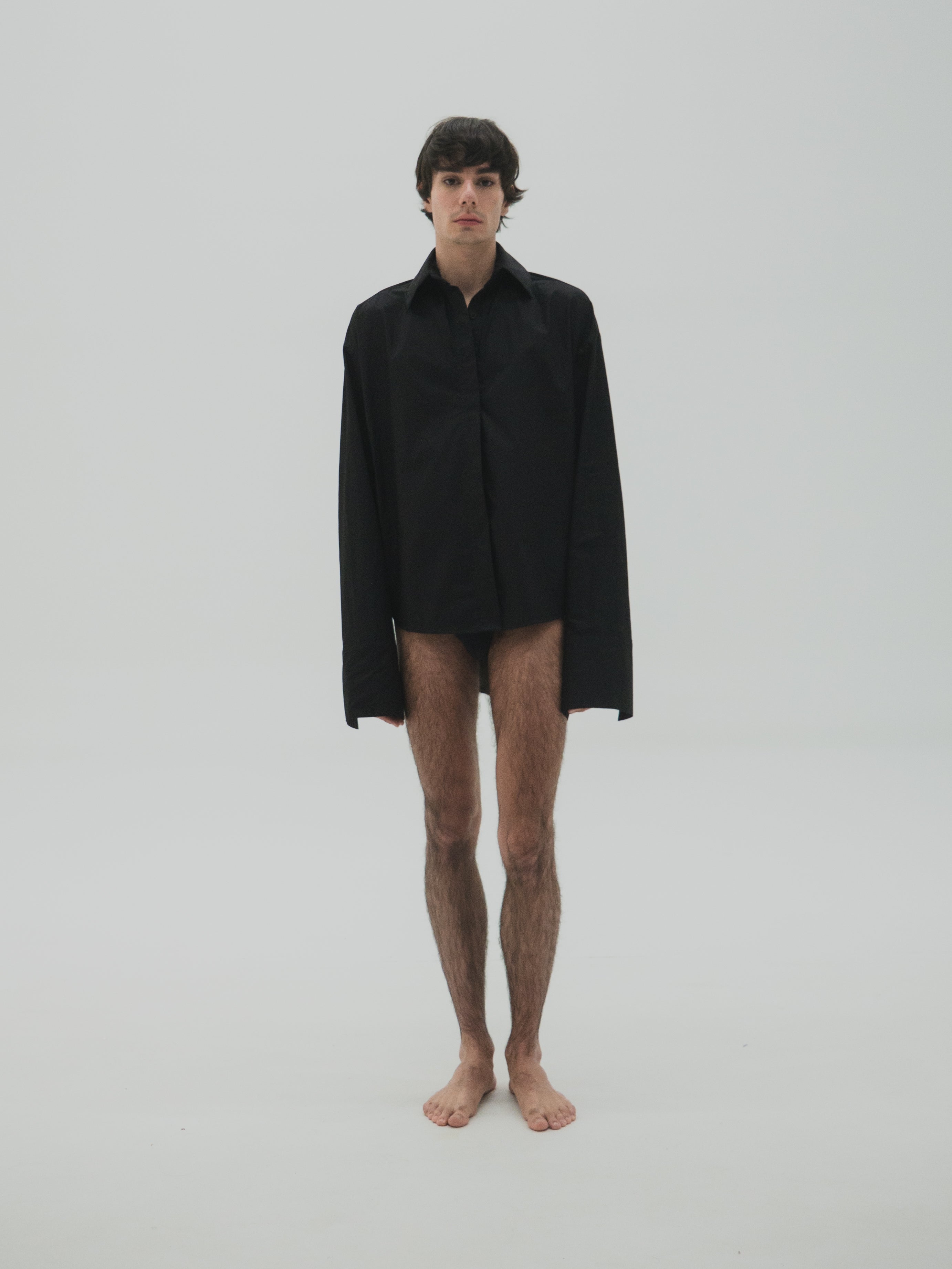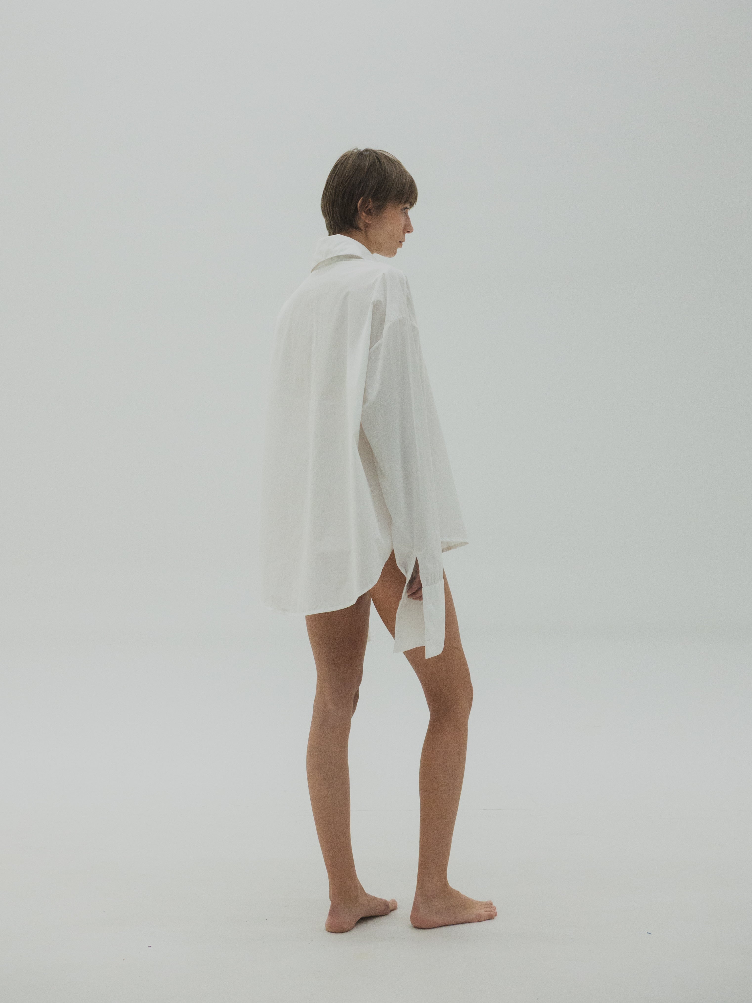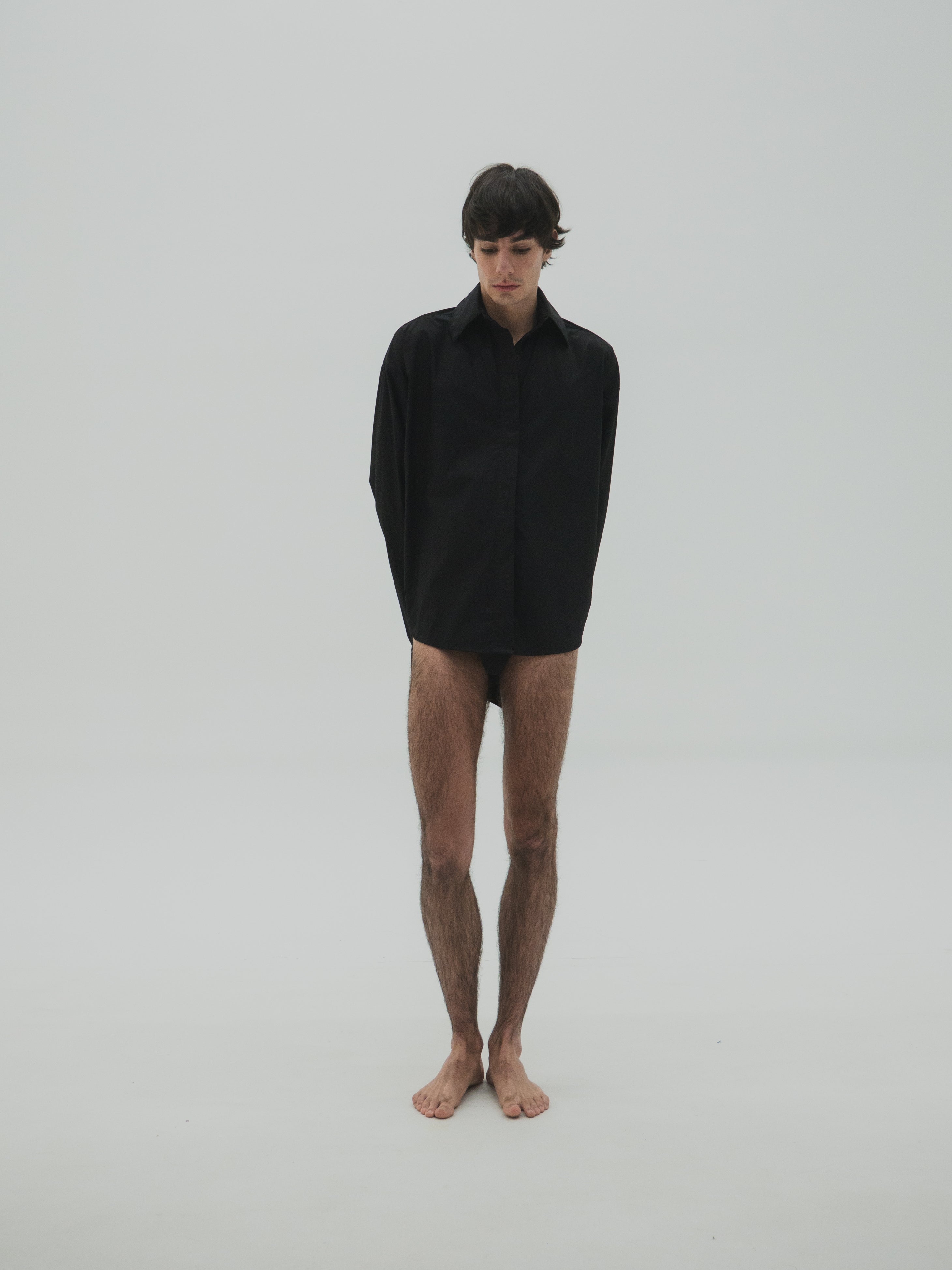 Camisa de estructura simétrica, confeccionada en algodón 100%. Con mangas y puños extra largos que aportan volumen a la pieza. El cuello alto añade un toque formal a una silueta ligera, equilibrando proporción y estructura con acabados limpios y funcionales.
