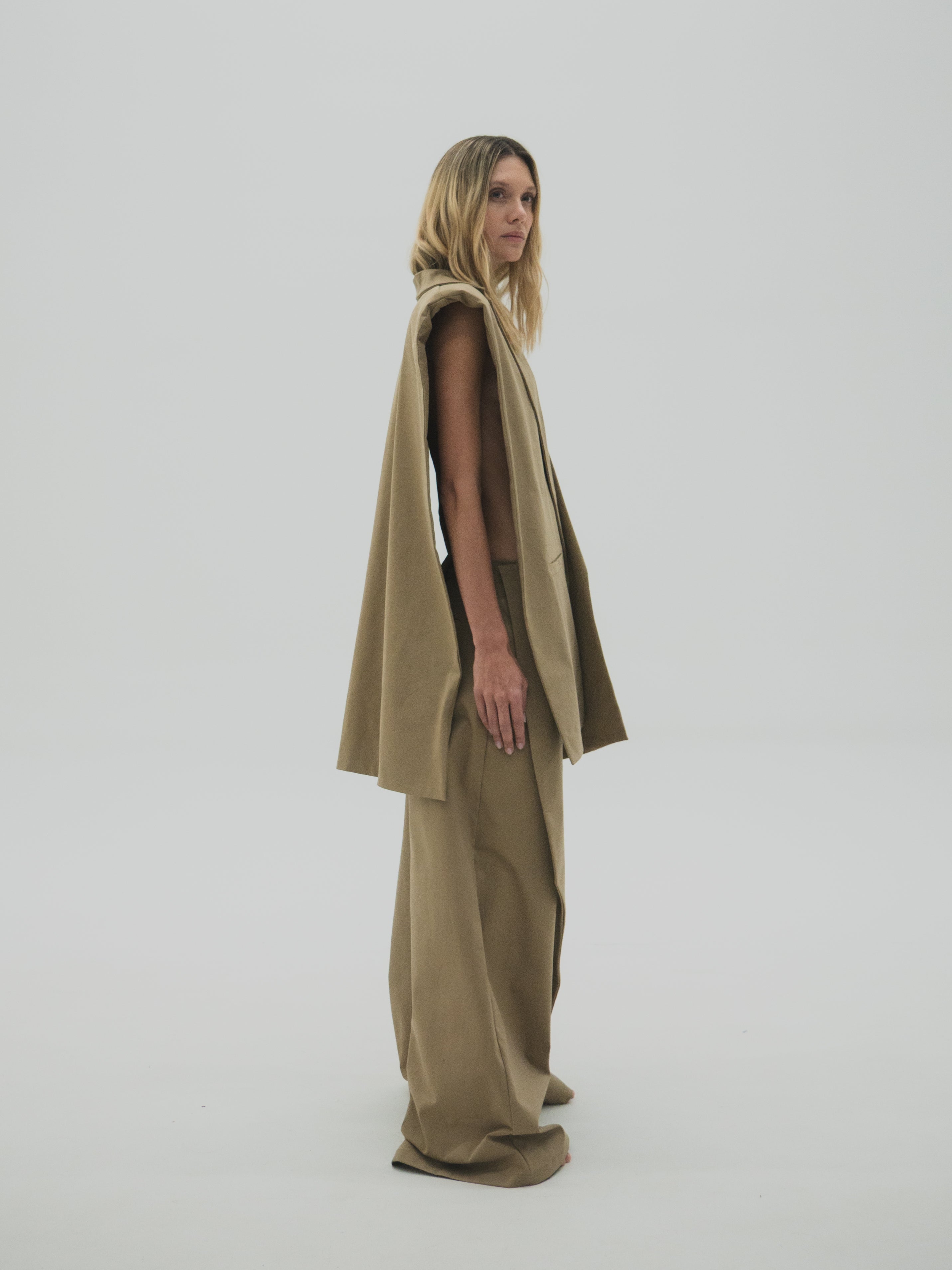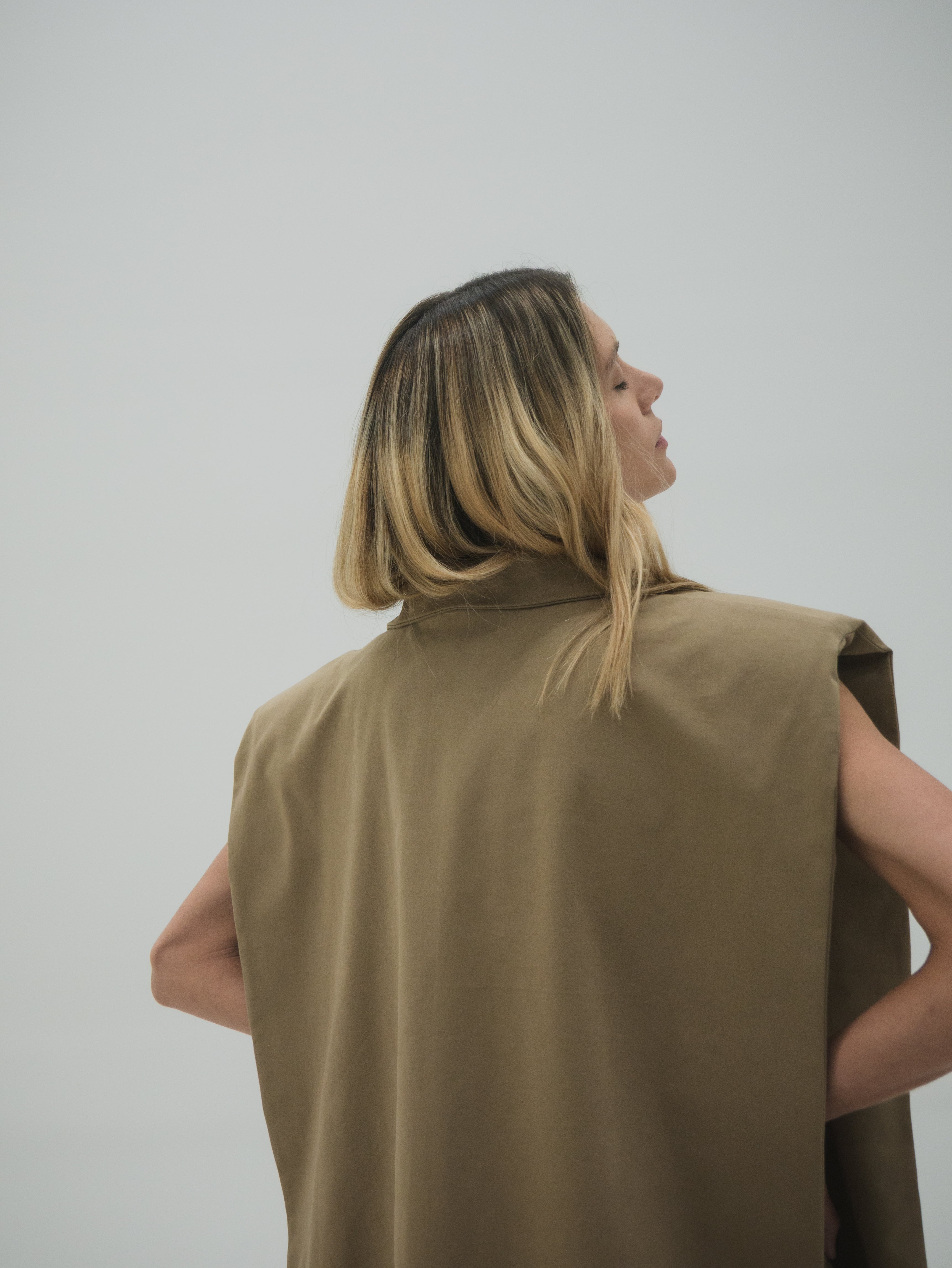 Maxi chaleco estructurado oversize sin mangas con cortes simétricos en los laterales y hombreras.