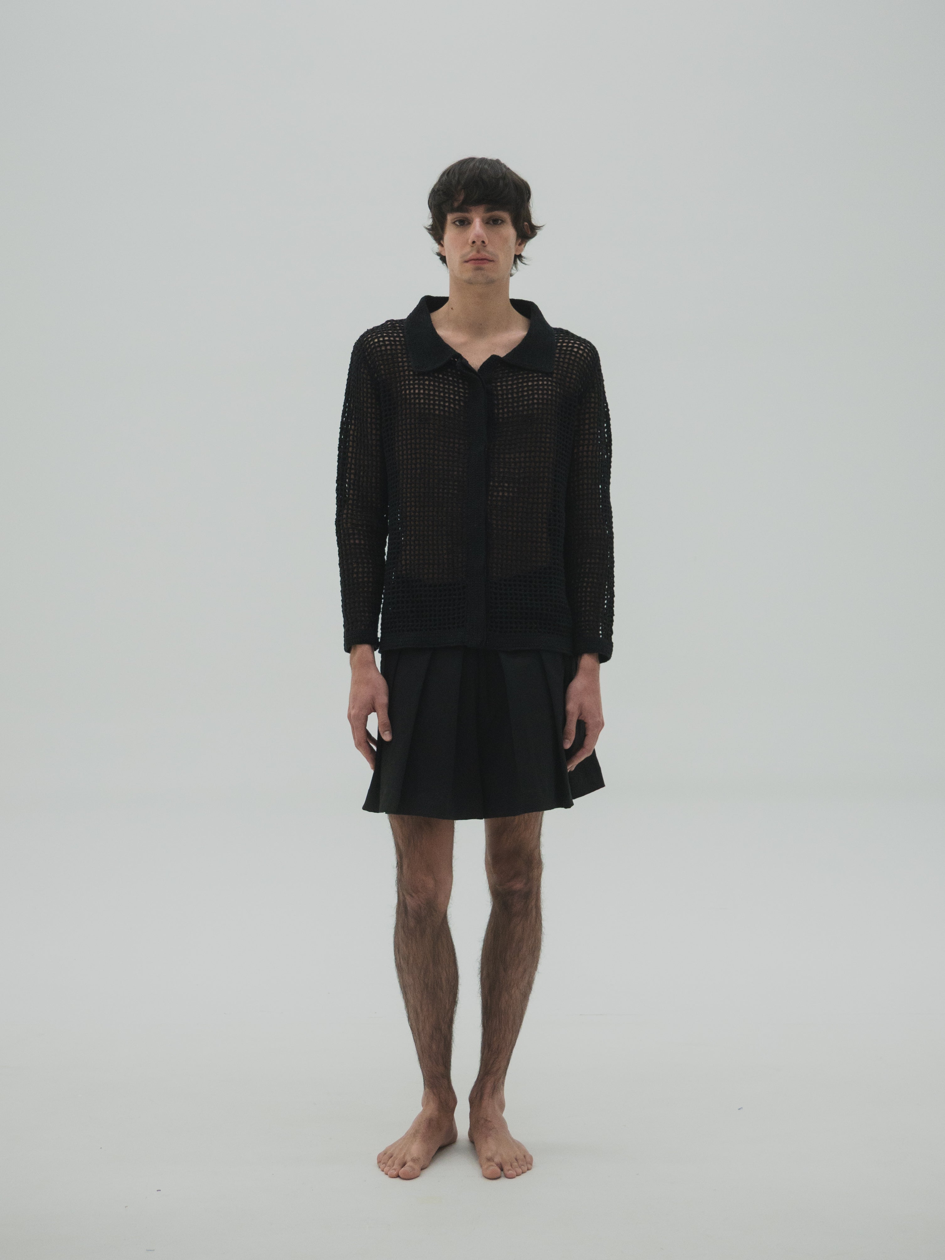 Prenda de construcción híbrida que integra patrón de shorts con apariencia de falda. Estructura basada en pliegues anchos para generar volumen simétrico. Corte de sastrería con énfasis en la caída y la forma.