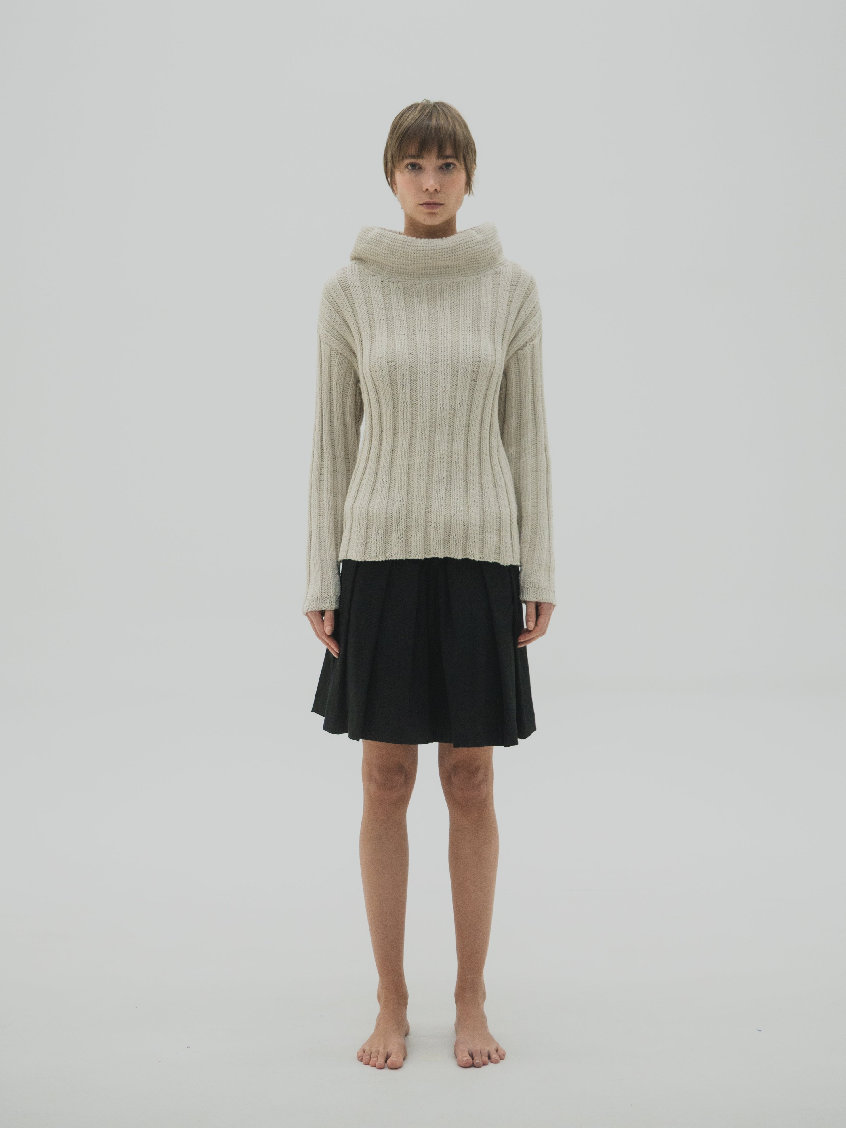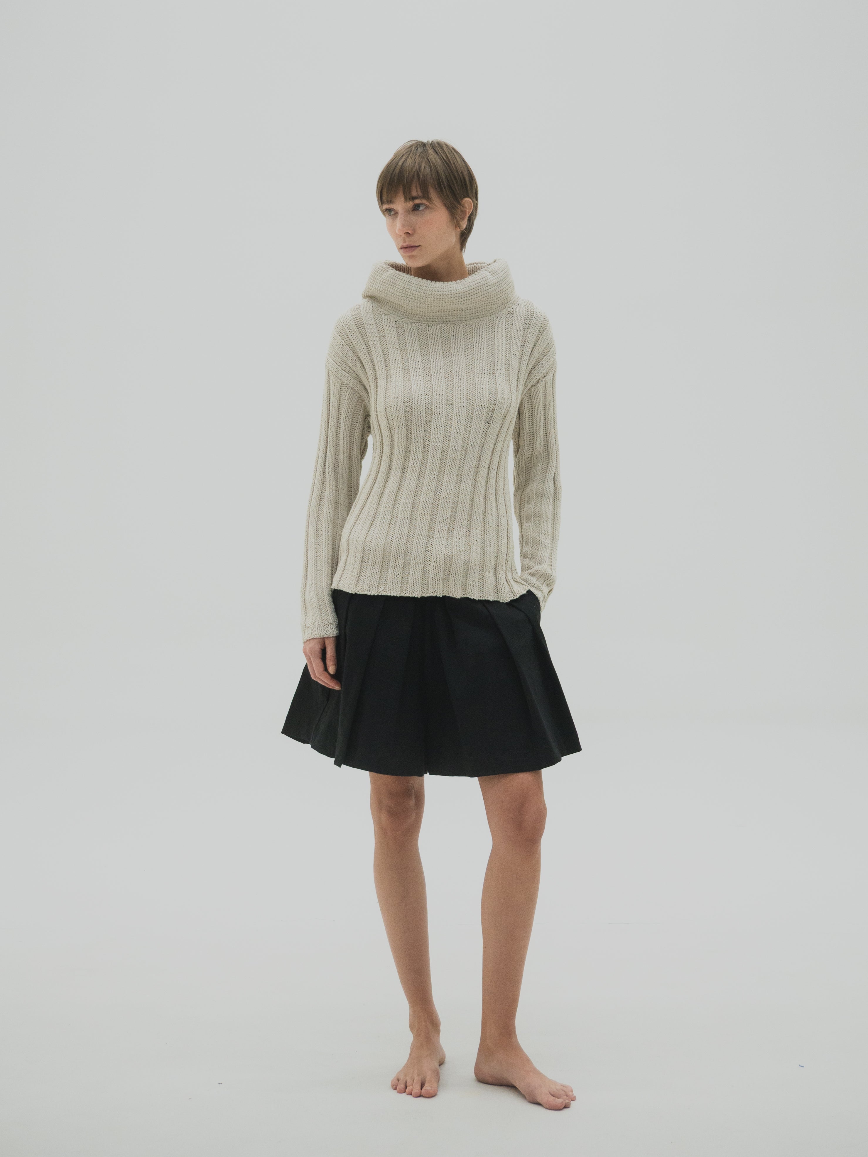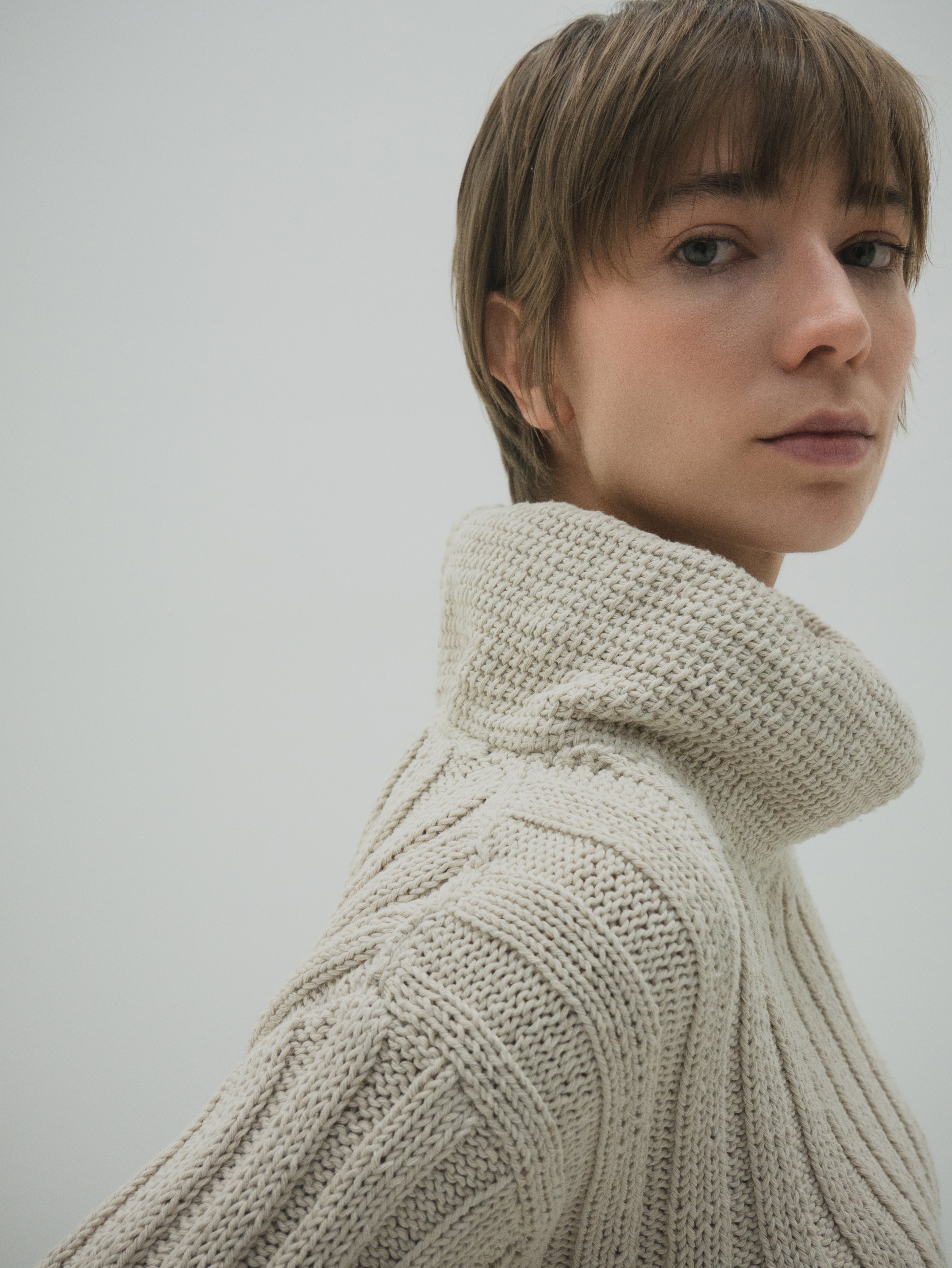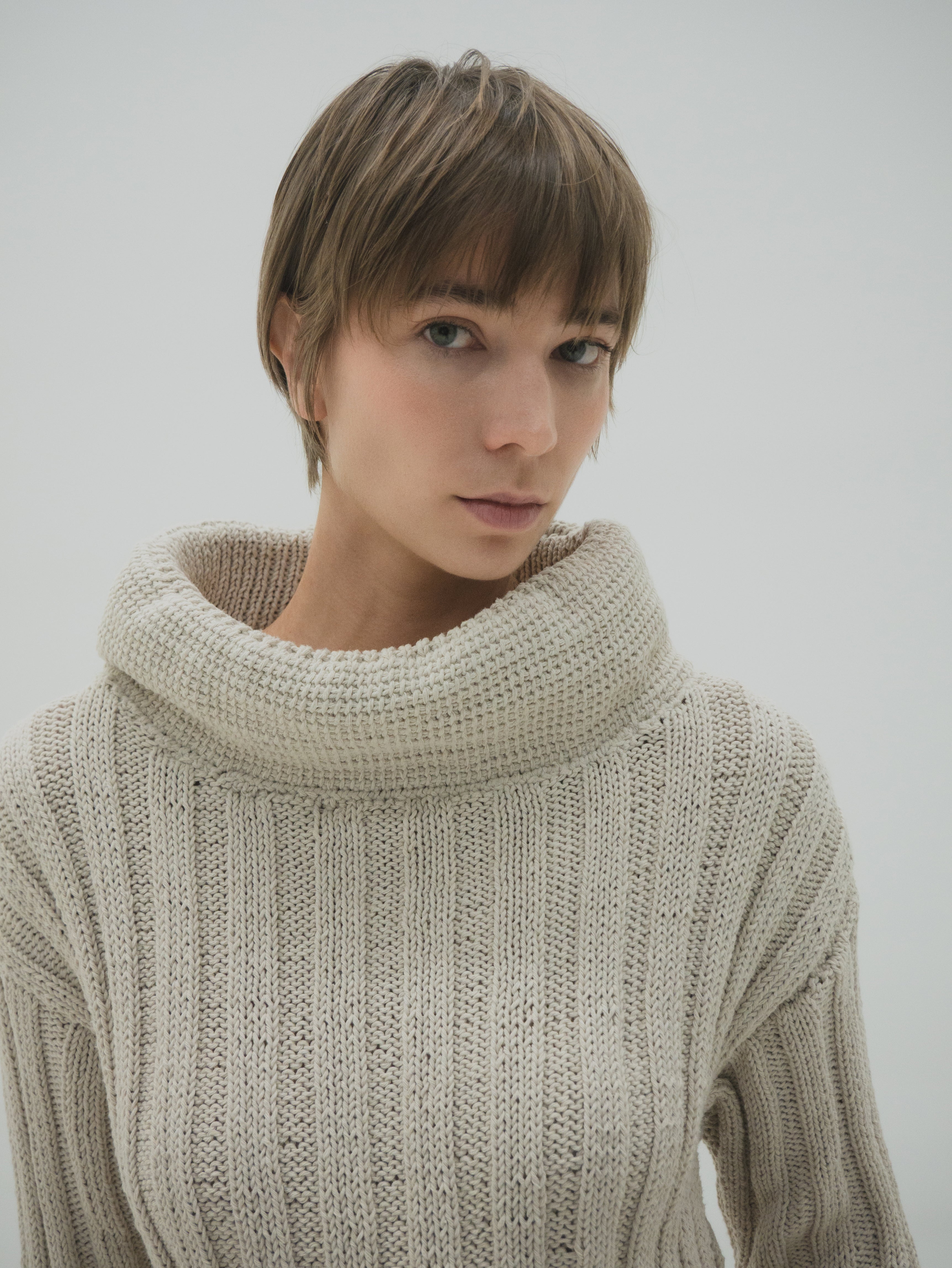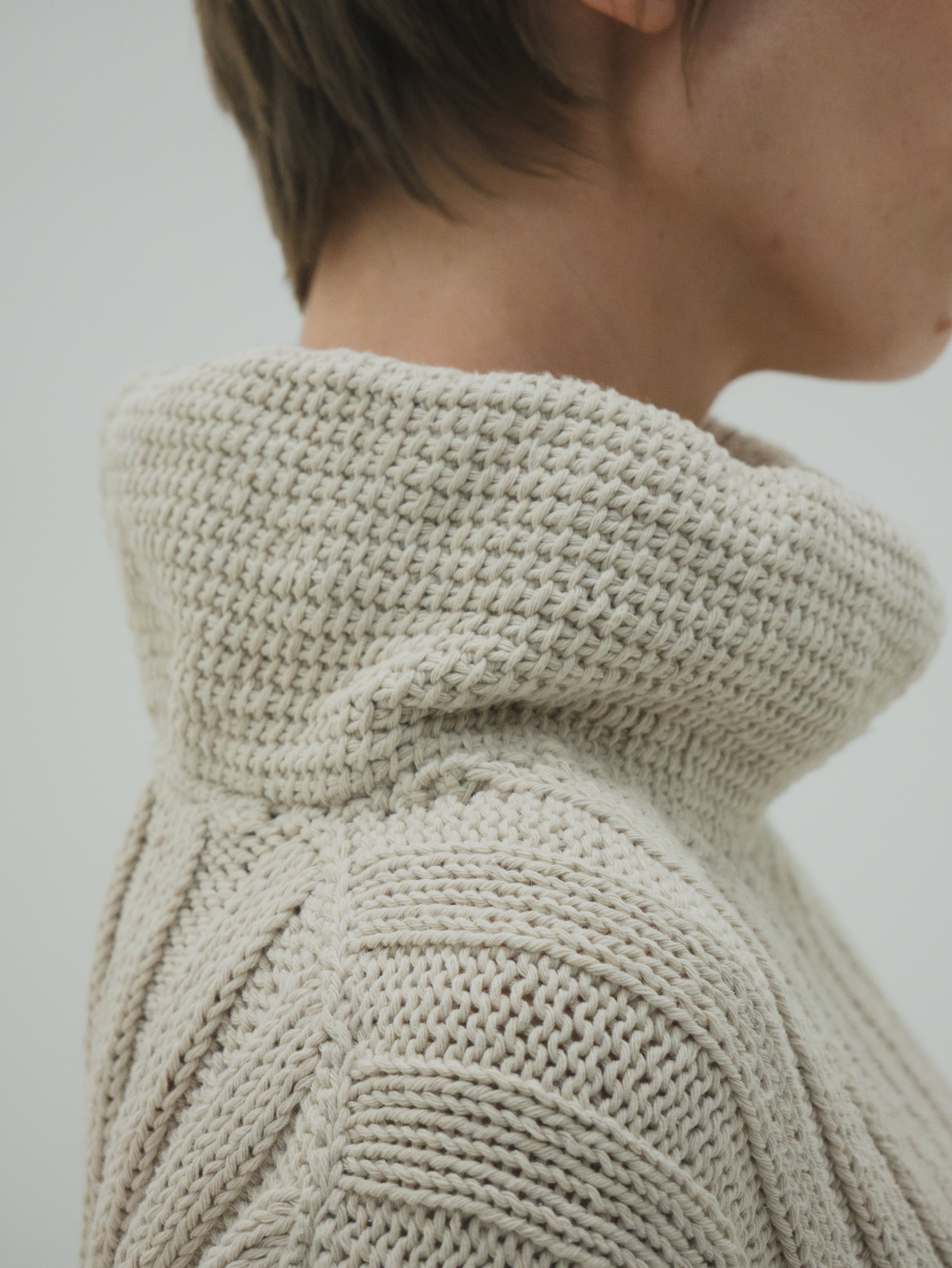 Sweater manga larga con cuello estructurado tejido 100% a mano en técnica crochet y dos agujas.